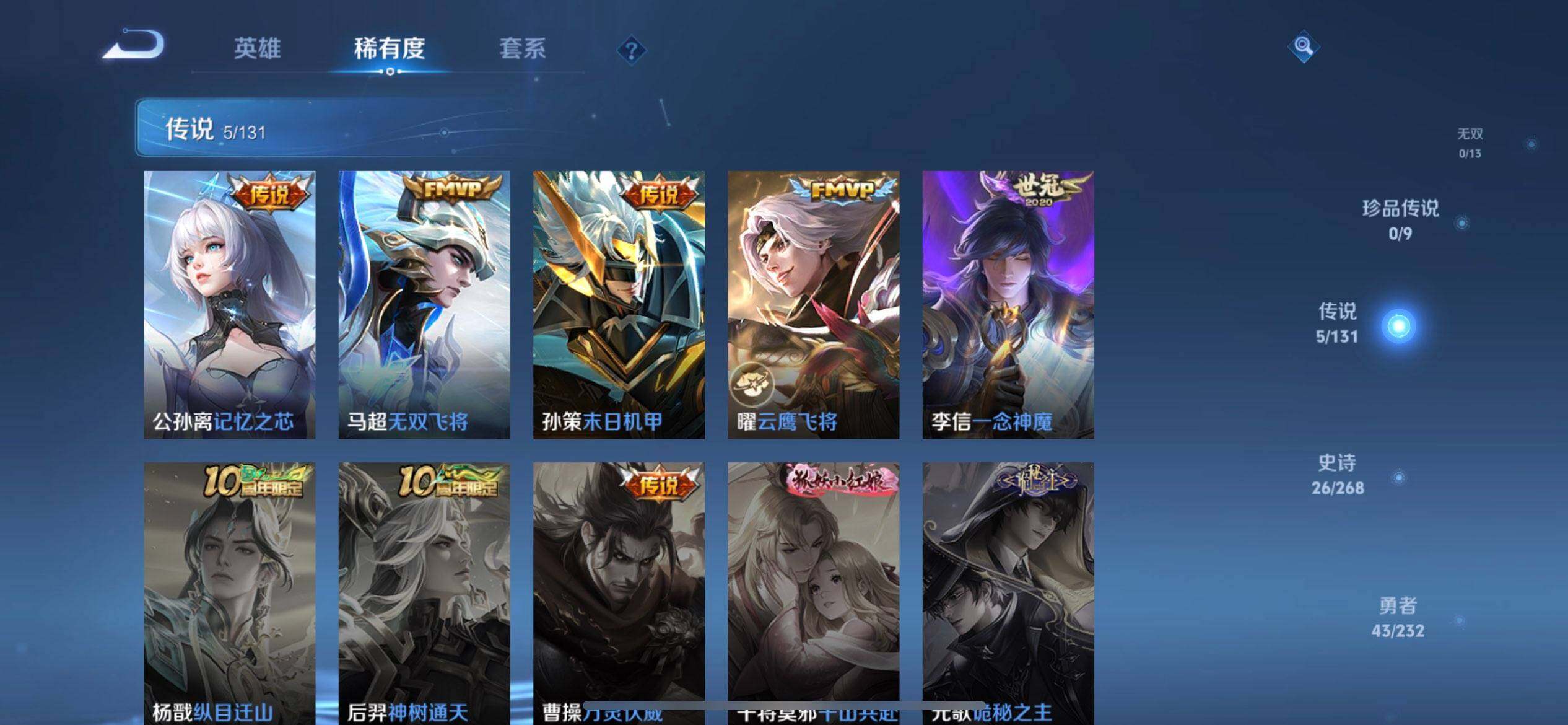 【传说皮肤】:公孙离记忆之芯,马超无双飞将,孙策末日机甲,曜云鹰飞将,李信一念神魔