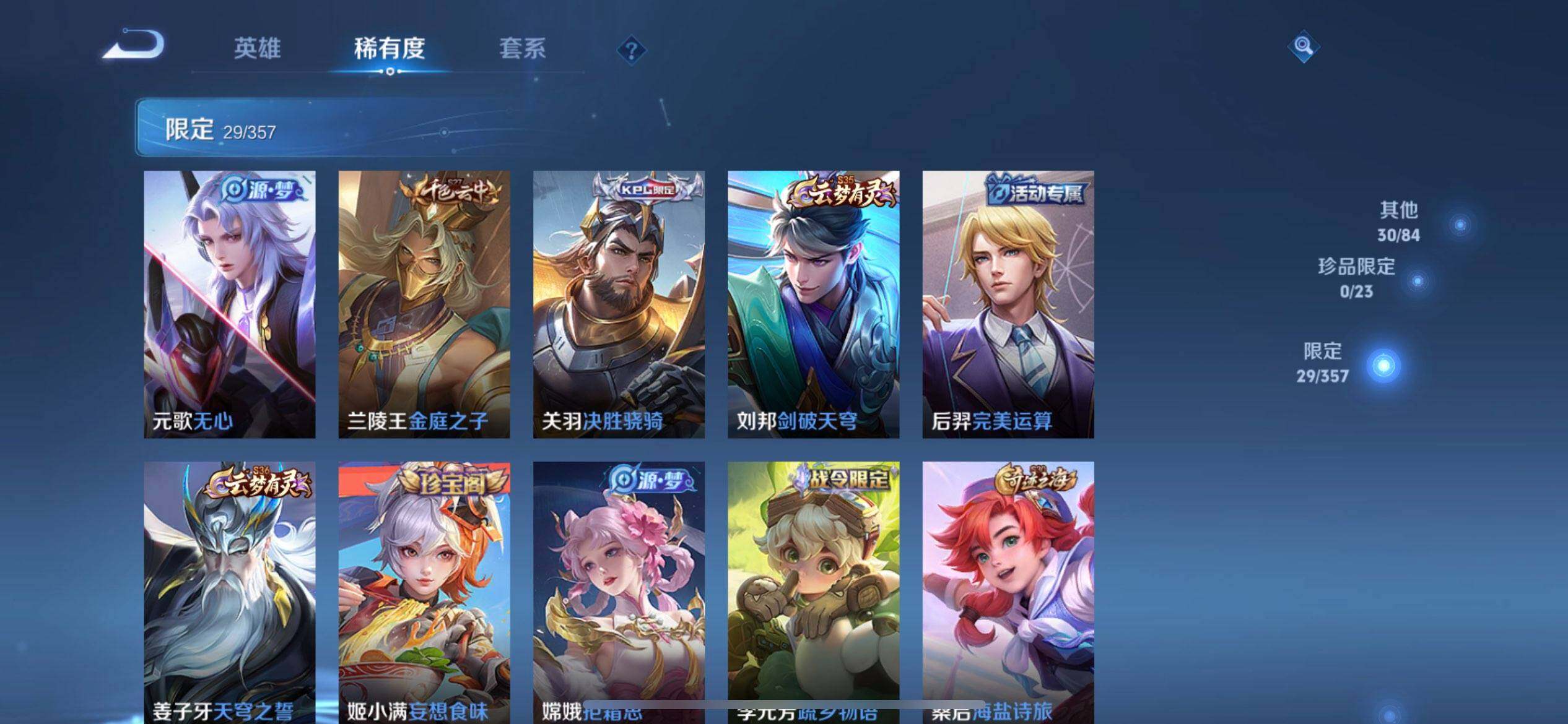 【限定皮肤】:姜子牙天穹之誓,狄仁杰阴阳师,赵云皇家上将,元歌无心,狄仁杰魔术师,达摩沙漠行僧,项羽海滩派对,韩信傲雪梅枪