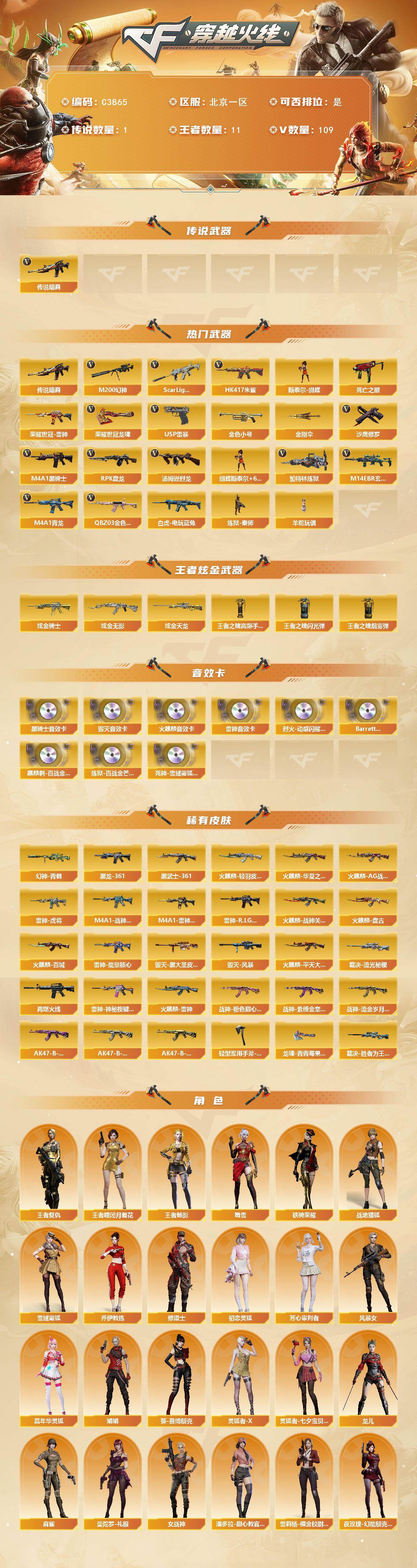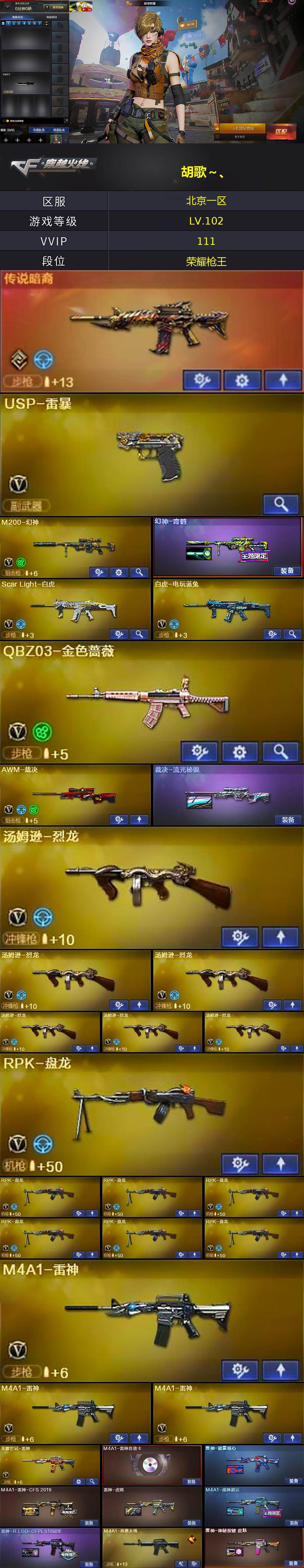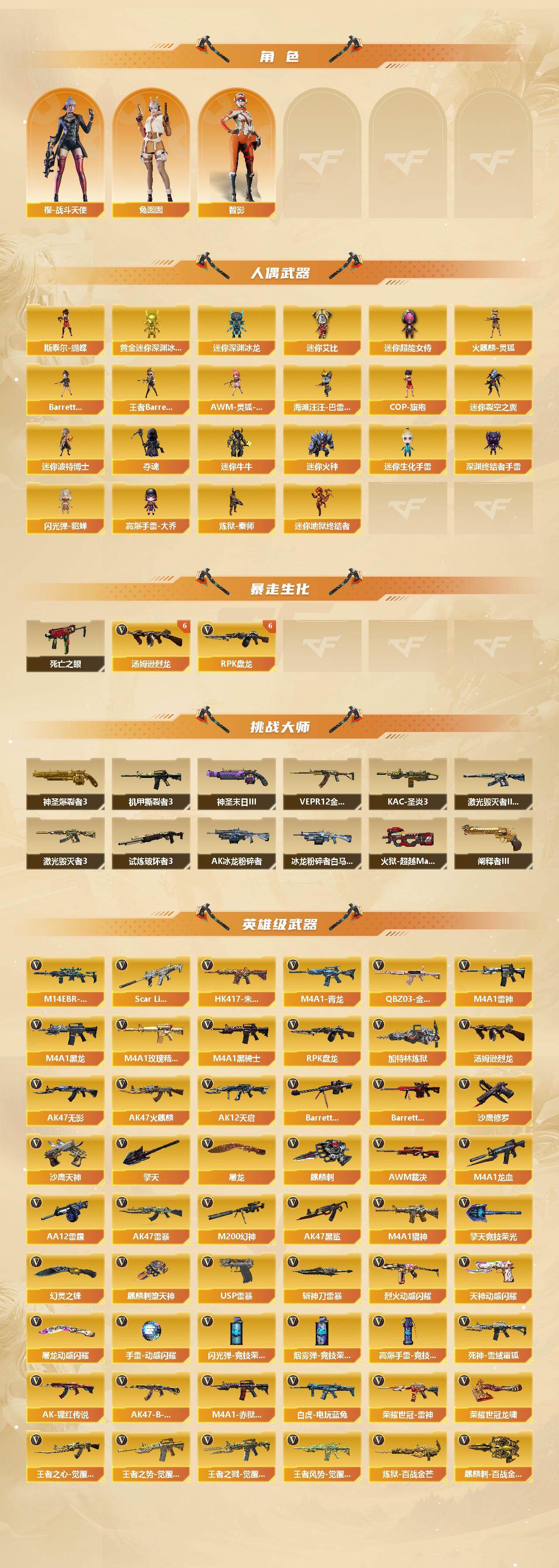 【热门武器】:传说暗裔,QBZ03-金色蔷薇,M14EBR-玄武,Scar Light-白虎,HK417-朱雀,M4A1-青龙,M200-幻神,死亡之眼,荣耀世冠-雷神,白虎-电玩蓝兔,金色小号,M4A1-黑骑士*2,汤姆逊-烈龙*6,RPK-盘龙*7,加特林-炼狱,斯泰尔-蝴蝶,炼狱-秦师,羊驼玩偶,USP-雷暴,沙鹰-修罗*3,荣耀世冠-龙啸,金刚伞