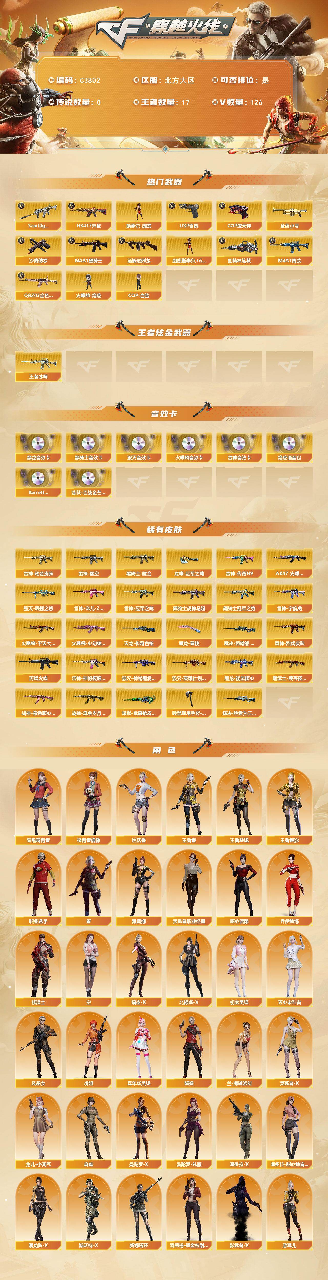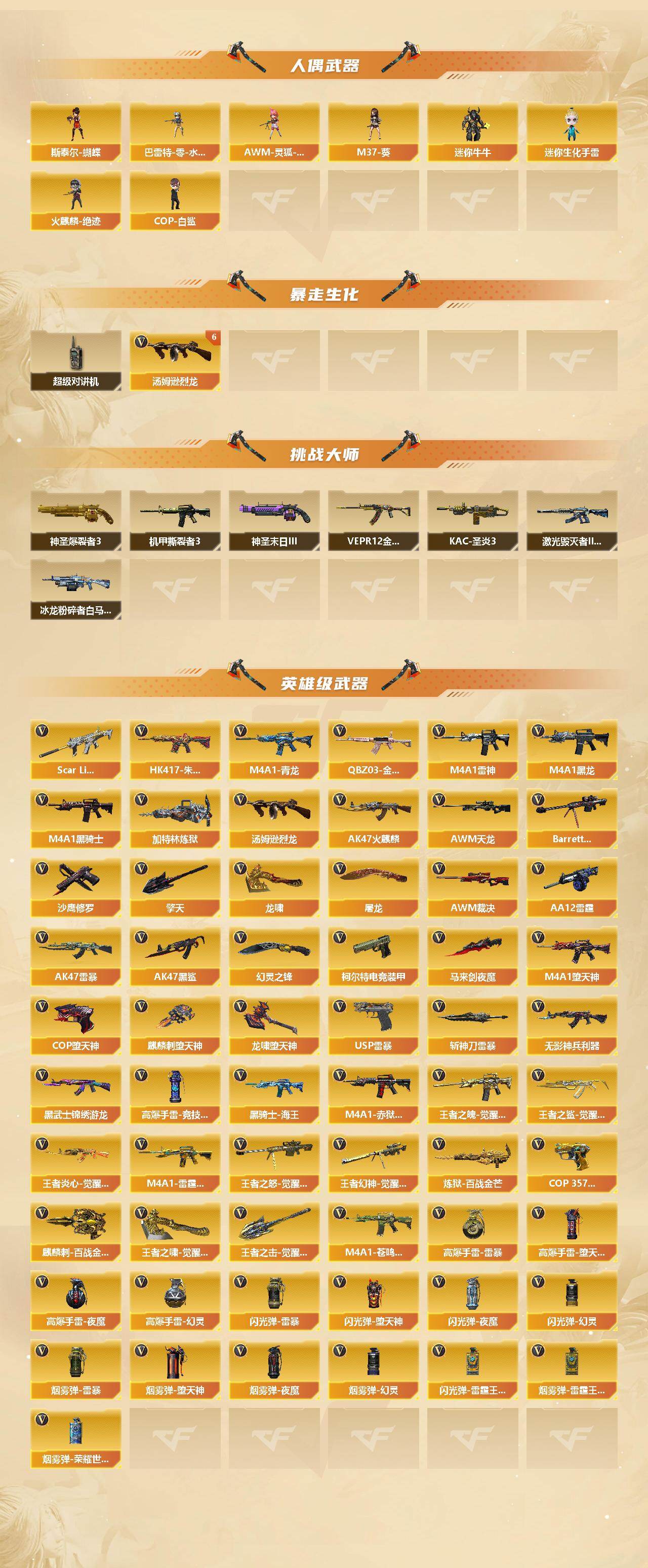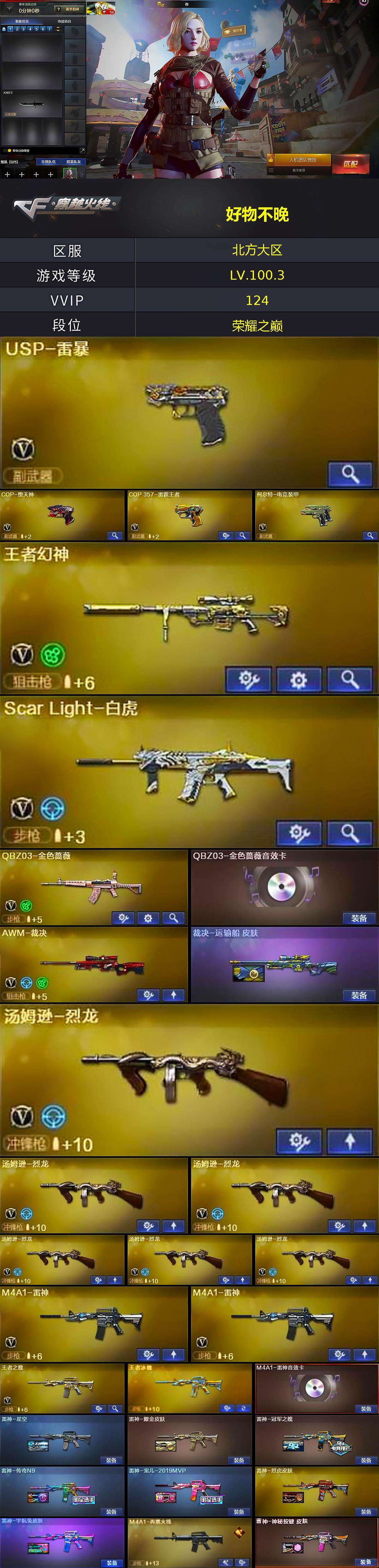 【热门武器】:QBZ03-金色蔷薇,Scar Light-白虎,HK417-朱雀,M4A1-青龙,金色小号,M4A1-黑骑士,汤姆逊-烈龙*6,加特林-炼狱*2,斯泰尔-蝴蝶,火麒麟-绝迹,COP-白鲨,USP-雷暴,COP-堕天神,沙鹰-修罗*5