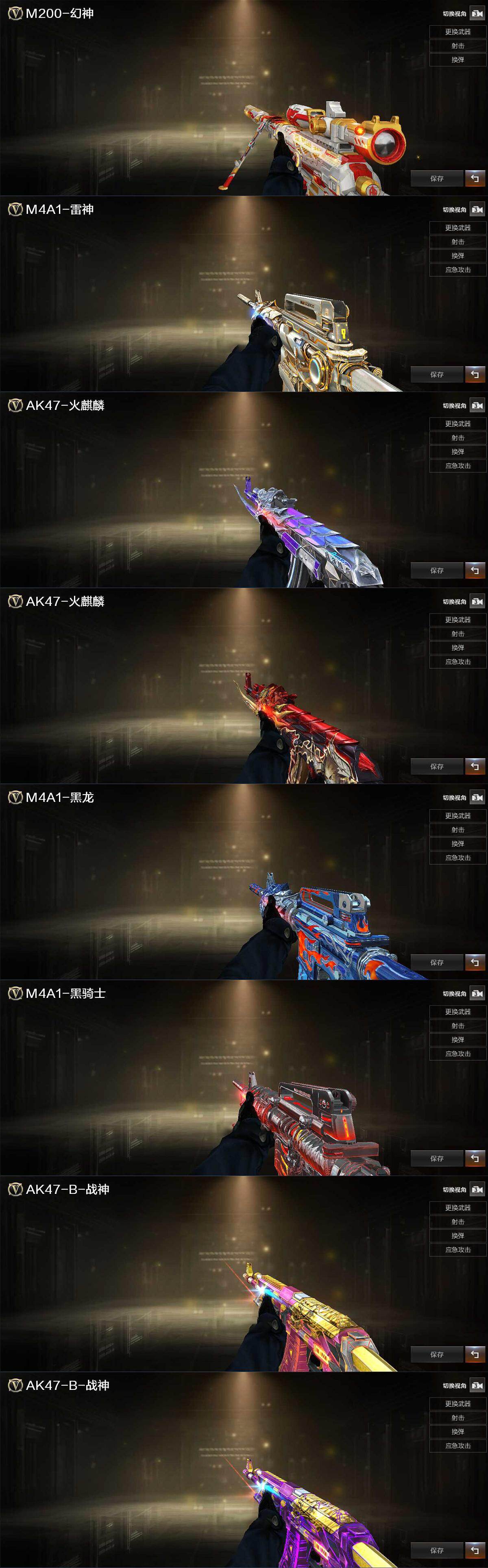 【热门武器】:QBZ03-金色蔷薇,M200-幻神,M200-竞技荣光,白虎-电玩蓝兔,M4A1-黑骑士,加特林-炼狱*2,火麒麟-绝迹,USP-雷暴,沙鹰-修罗