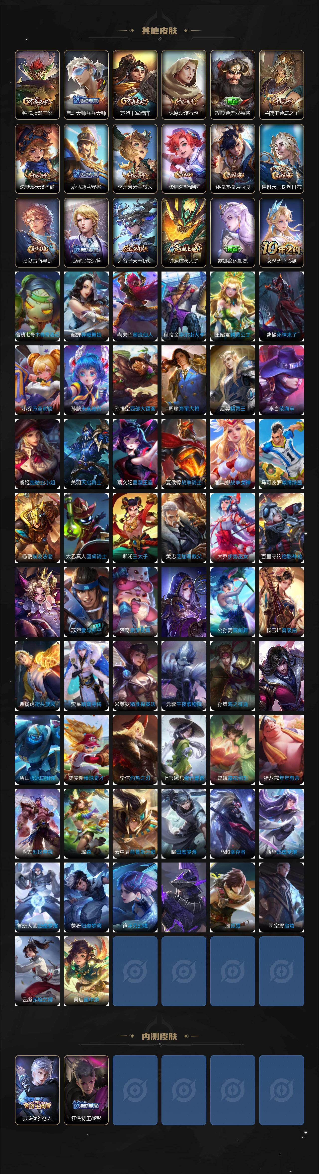 【限定皮肤】:狄仁杰阴阳师,赵云皇家上将,赵云龙胆,嬴政优雅恋人,嬴政白昼王子,庄周玄嵩,高渐离死亡摇滚,阿轲迷踪丽影,芈月重明,吕布天魔缭乱,吕布猎兽之王,周瑜赤莲之焰,元歌云间