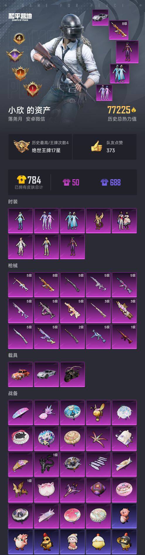 【AZH2248】安卓 微信【雪国梦幻火箭都市暗影哥特小丑鱼 八级至情至圣M416 粉熊背包 3载具】8粉装-15特效枪-3载具-8粉色飞行器-77225热力值-4王牌印记-146套装-235枪皮