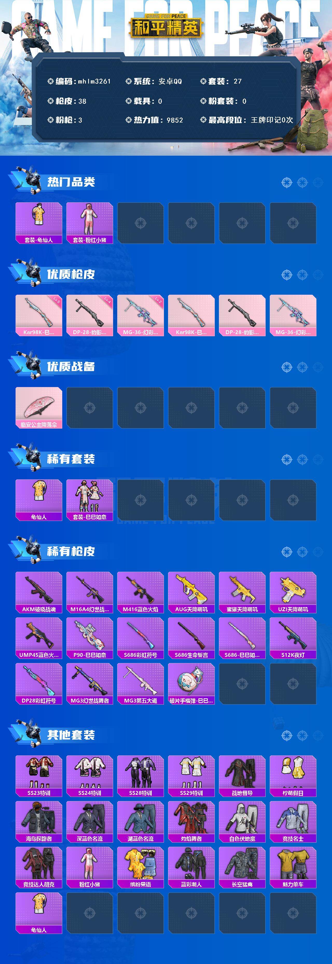 【mhlm3261】安卓 手Q-0粉装-3特效枪-0载具-0粉色飞行器-9852热力值-1王牌印记-27套装-38枪皮