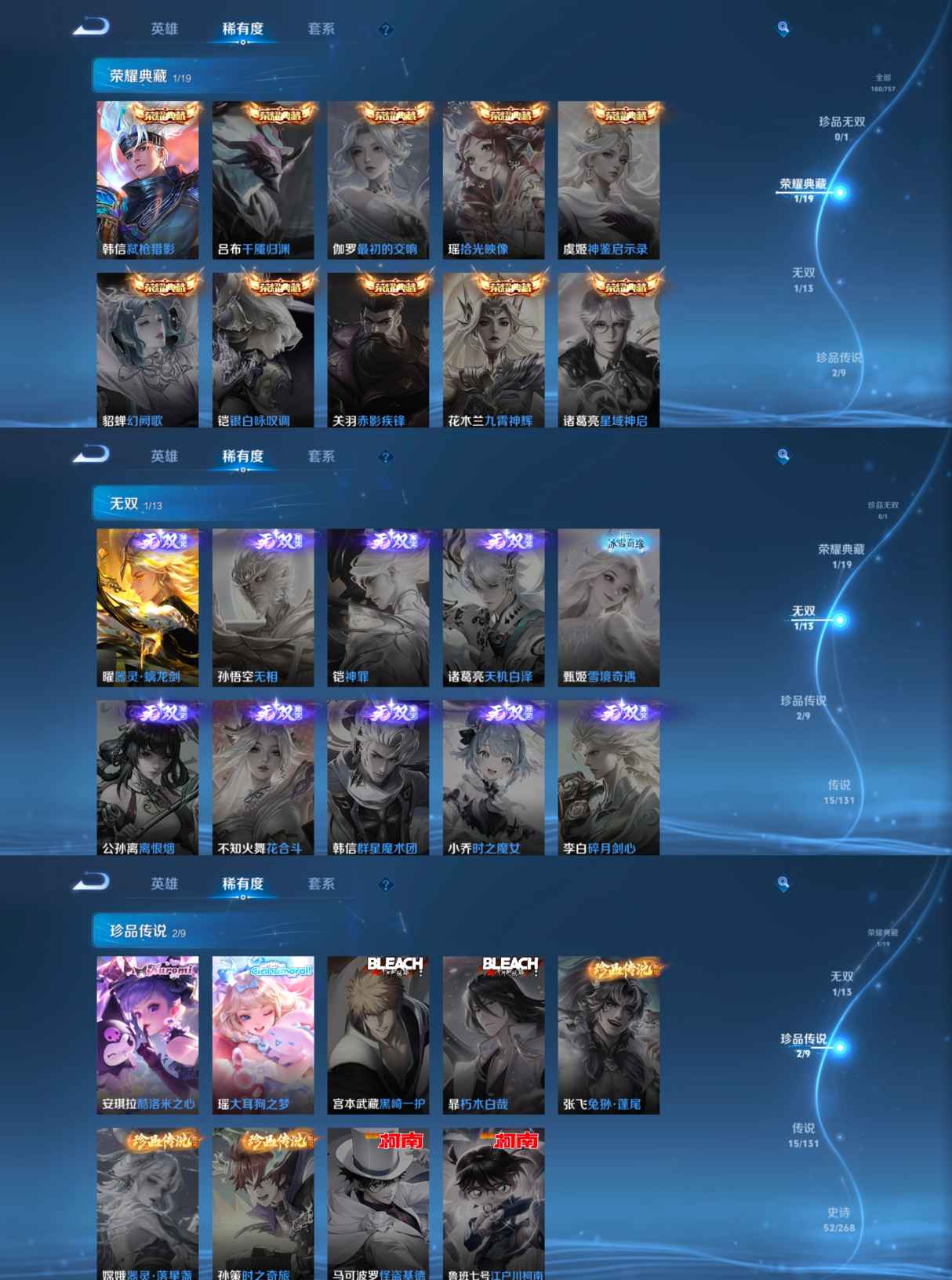 【传说皮肤】 妄想实况 鸣野蒿 霜月吟 逐花归海 续相思 幻光神枪 愿照·九州拓 诗剑行 绛天战甲 一念神魔 末日机甲 云鹰飞将 启明星使 黄金白羊座 淬星耀世