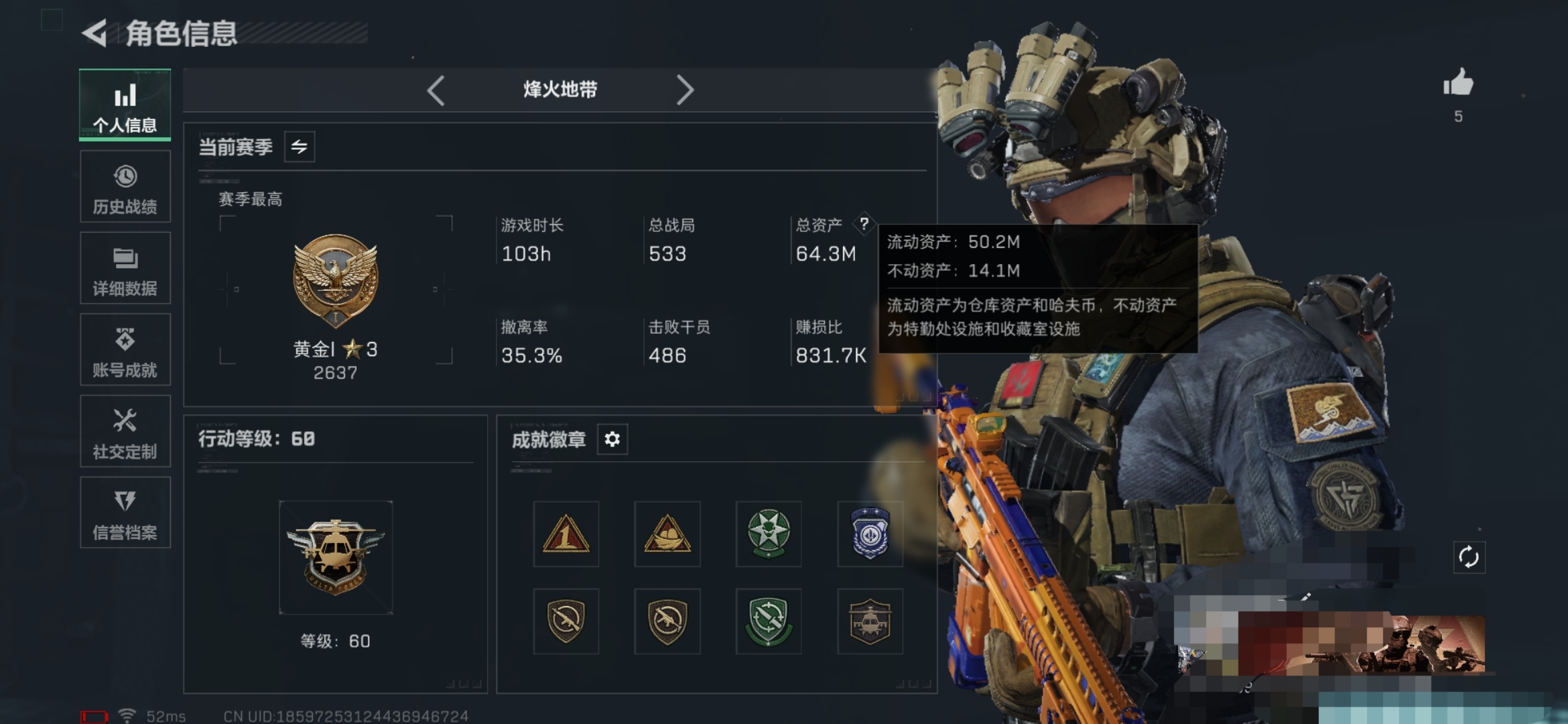 XXSJZ1815【仓库价值64.3M 哈夫币1200K 干员 红狼 电锯惊魂 露娜 金牌射手 骇爪 维什戴尔 传说枪皮8 赛季3X2】【总资产(M)】63.99M【哈夫币】1200K【行动等级】60【全面战场等级】16【烽火地带段位】黄金【干员皮肤】 骇爪-维什戴尔 露娜-金牌射手 红狼-电锯惊魂 【近战武器】黑鹰