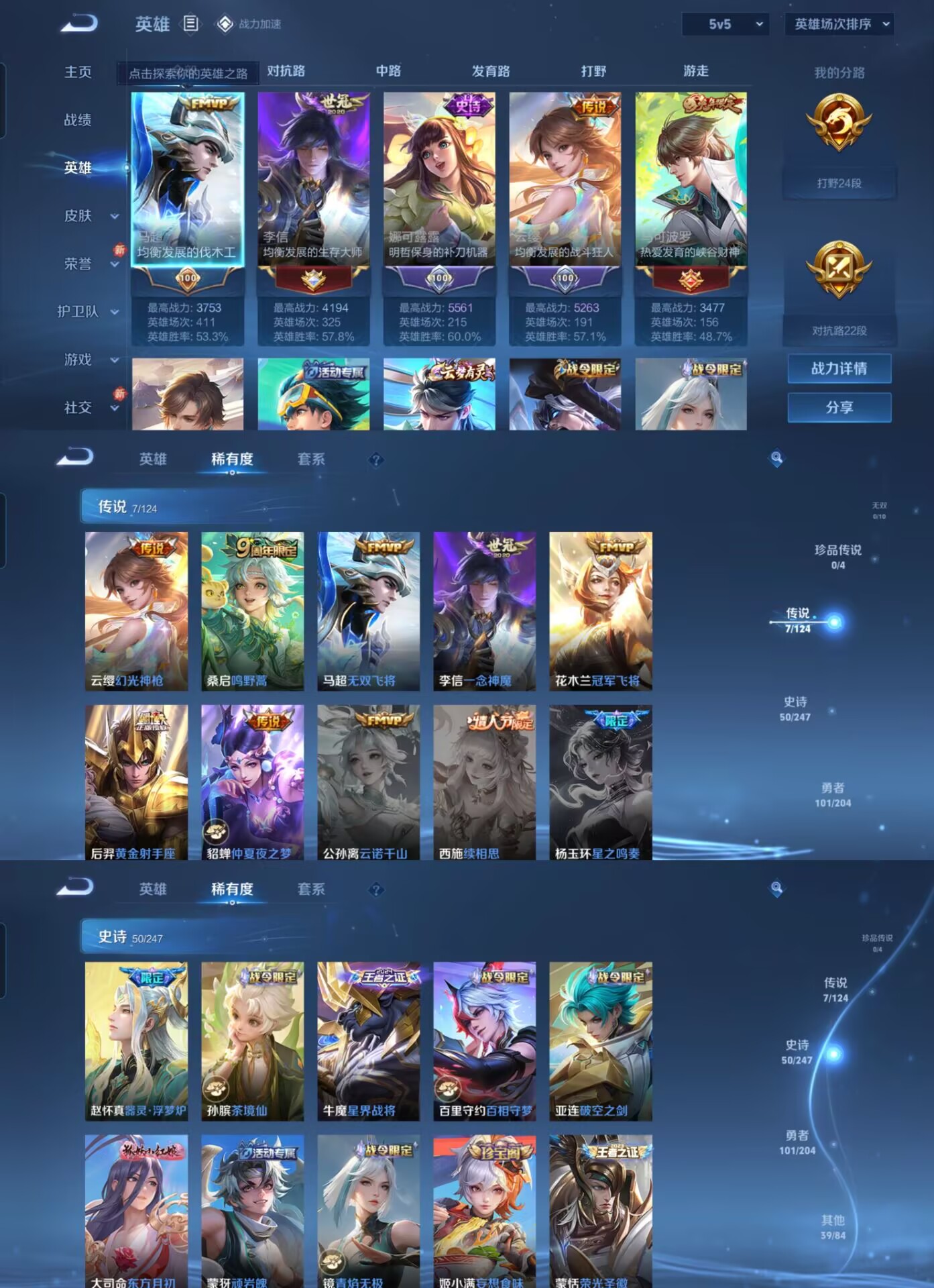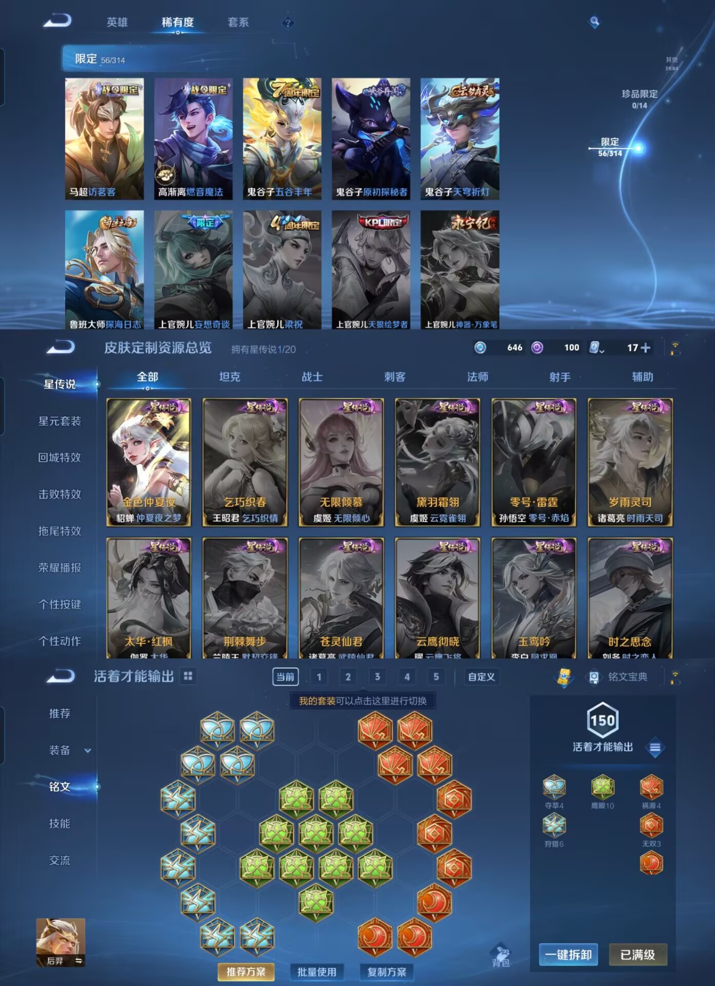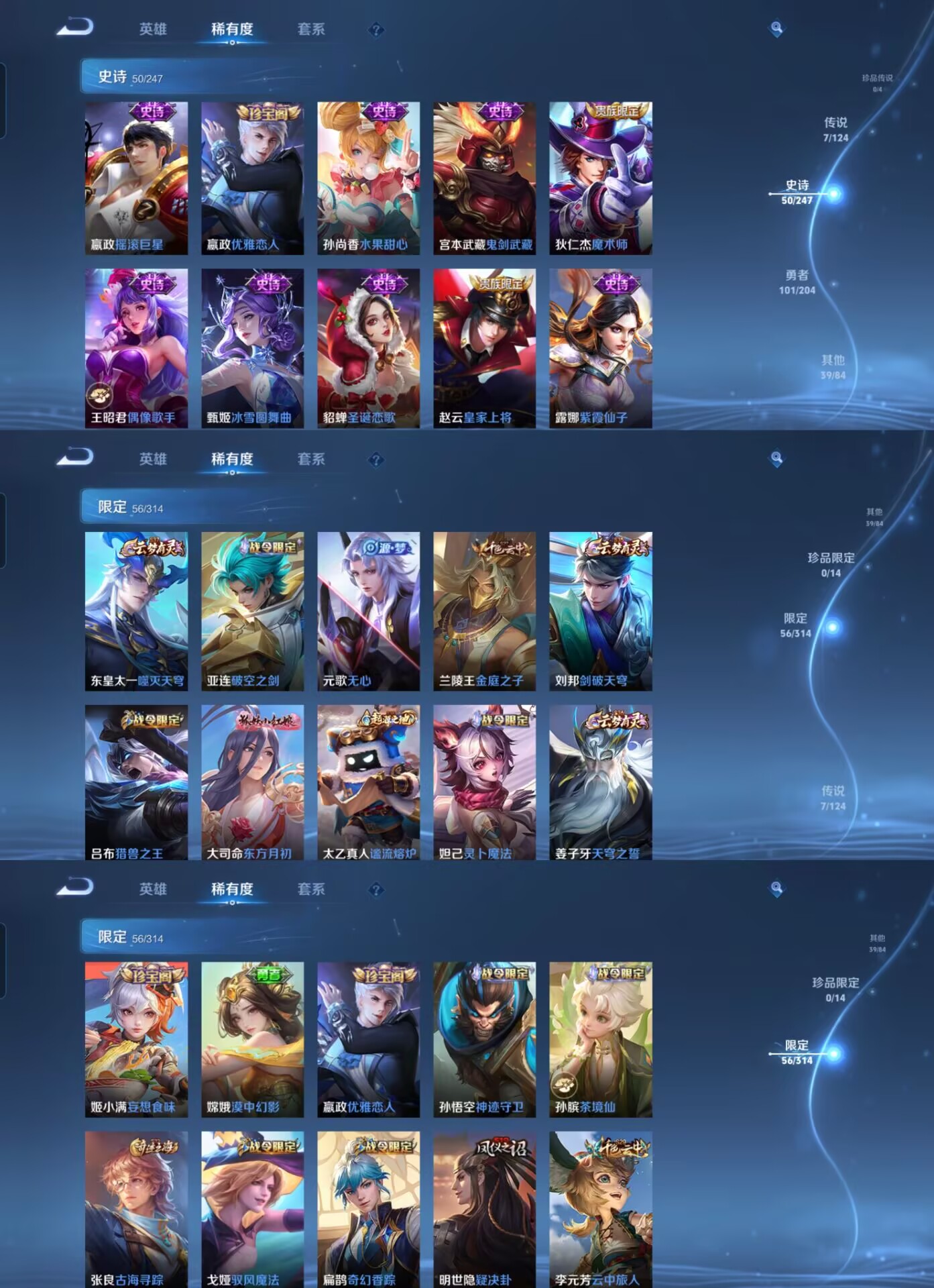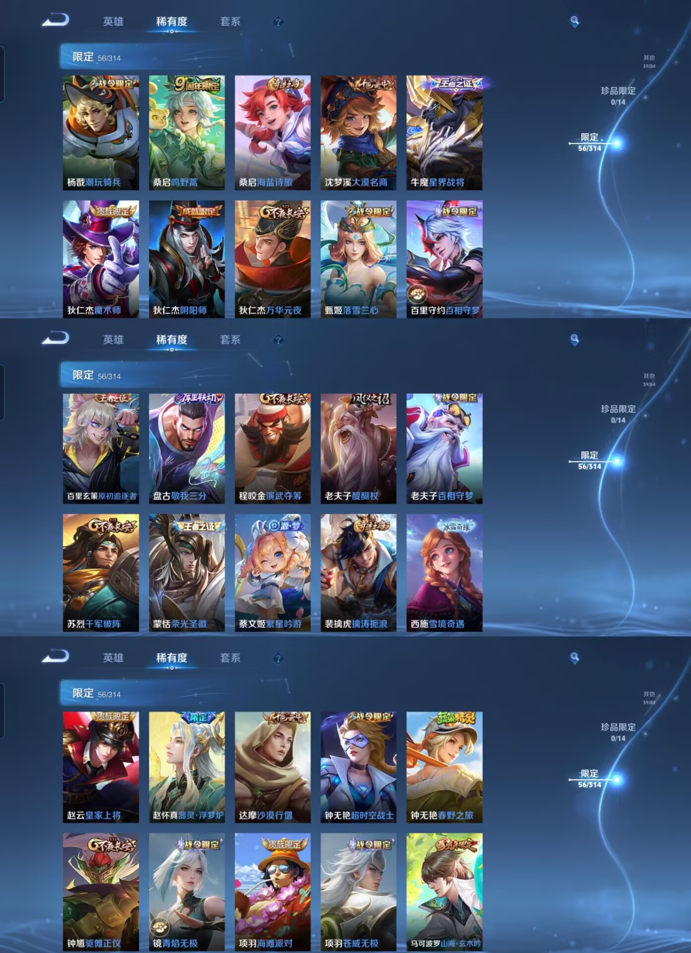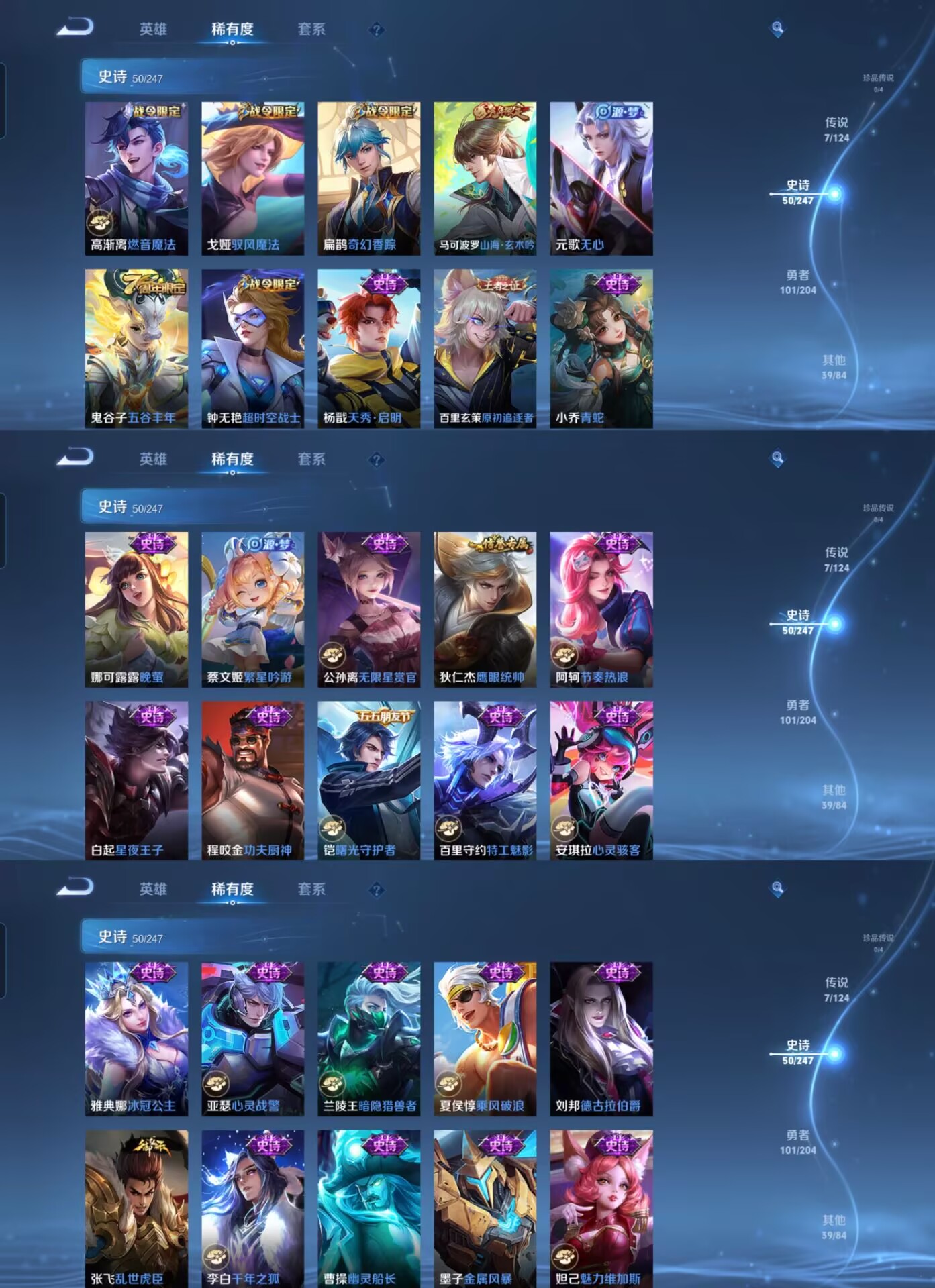 【史诗皮肤】 破空之剑 茶境仙 星界战将 百相守梦 器灵·浮梦炉 山海·玄木吟 青焰无极 苍威无极 聚星闪耀 决胜大满贯 荣光圣徽 漠中幻影 顽岩魄 东方月初 超时空战士 奇幻香踪 驭风魔法 幽灵船长 繁星吟游 功夫厨神 魅力维加斯 魔术师 鹰眼统帅 圣诞恋歌 无限星赏官 鬼剑武藏 曙光守护者 暗隐猎兽者 千年之狐 德古拉伯爵