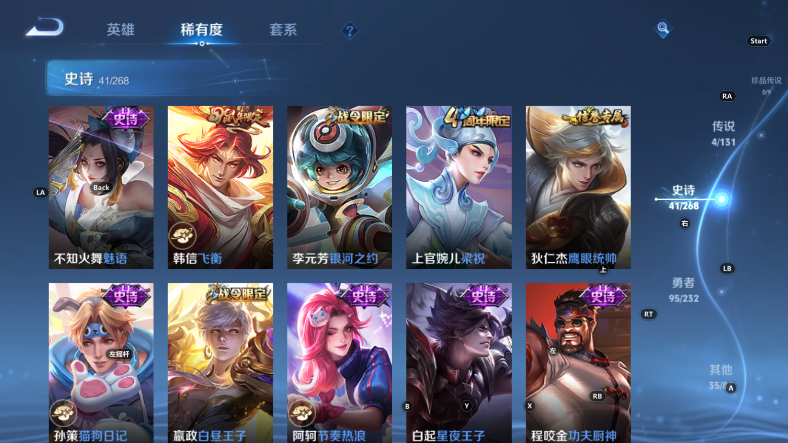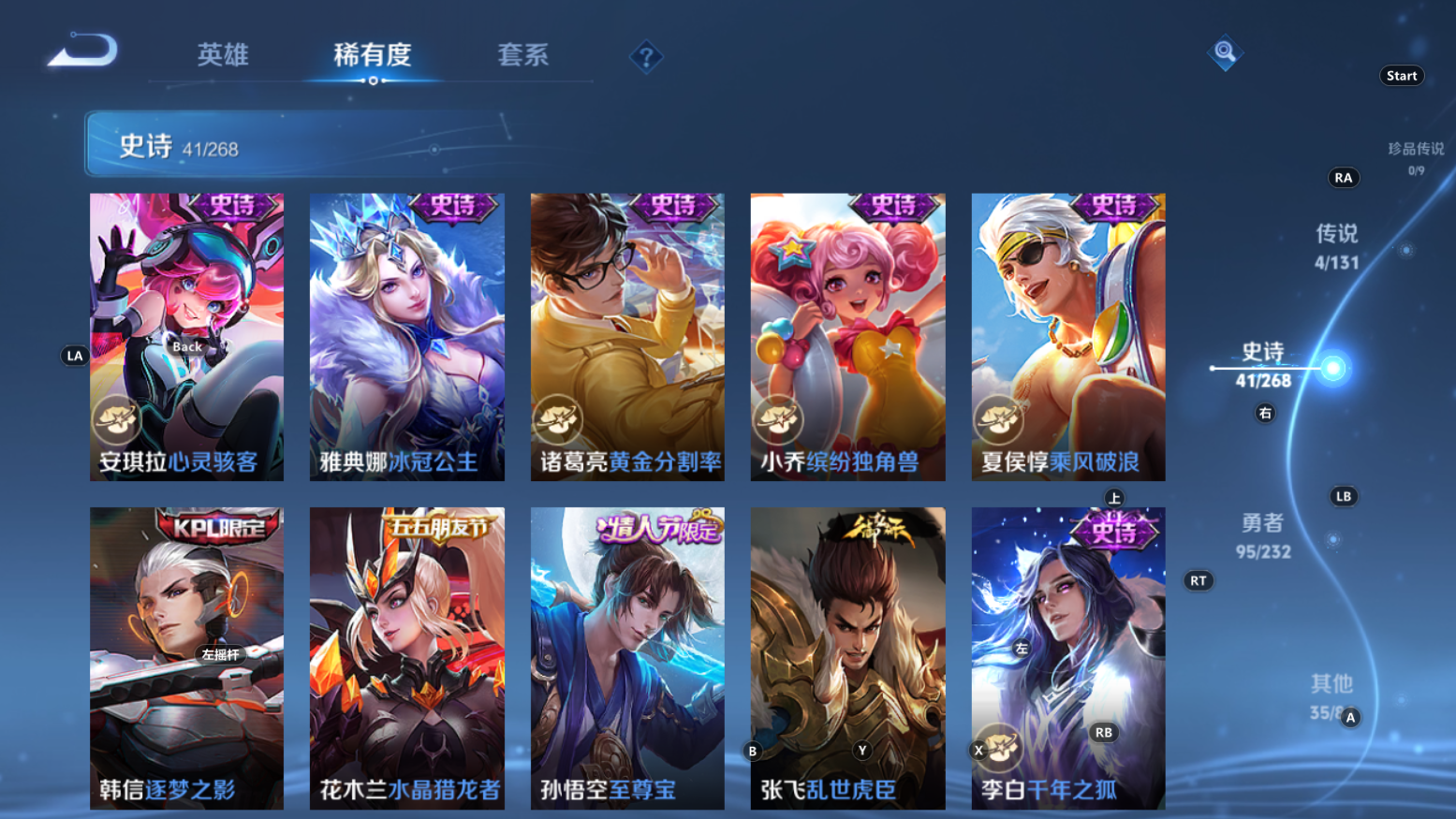 【史诗皮肤】 绮世丹青 破空之剑 逐梦之影 飞衡 电玩小子 至尊宝 谪仙醉月 西部游侠 浪漫序章 谧流熔炉 劲辣红锅 万灵启世 威尼斯狂欢 罗小黑战记 玫蓝誓约 逆浪荇歌 星界游侠 魅语 幽灵船长 功夫厨神 魅力维加斯 魔术师 鹰眼统帅 鬼剑武藏 水晶猎龙者 修罗 千年之狐 银河之约 紫霞仙子 金属风暴 梁祝 猫狗日记 水果甜心 偶像歌手 乘风破浪 缤纷独角兽 冰冠公主 白昼王