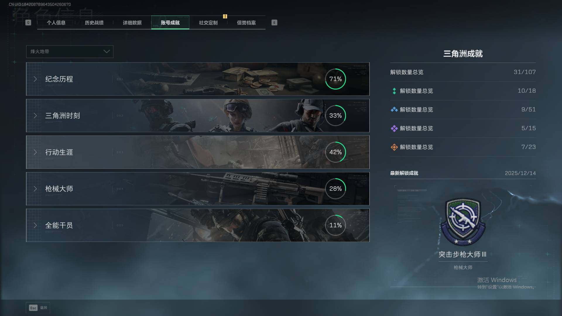 总资产(M):126M/哈夫币(K):698K/ /传说枪皮数:24/全面战场等级:14_段位:列兵/烽火地带等级:60_段位:三角洲巅峰/