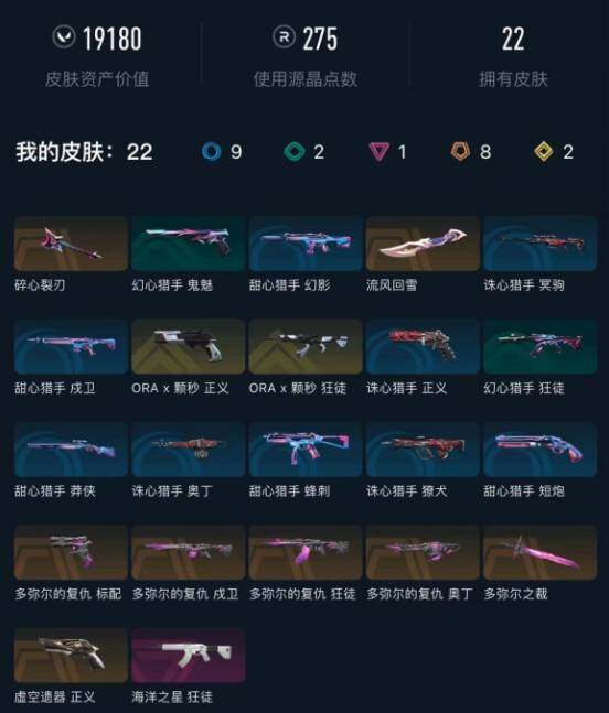 【WWC995】终极*8/传奇*2/卓越*1/皮肤*22/等级*30/段位:黄金/多弥尔的复仇套装/炼狱/暮蝶/捷风/雷兹/幽影/不死鸟/贤者/猎枭/芮娜/霓虹/夜露/黑梦/近战武器-流风回雪/近战武器-多弥尔之裁/狂徒-多弥尔的复仇/狂徒-ORA x 颗秒/狂徒-海洋之星/戍卫-多弥尔的复仇/奥丁-多弥尔的复仇/标配-多弥尔的复仇/正义-虚空遗器/正义-ORA x 颗秒/南瓜盛典 卡面/正义的化身 卡面/暗枪 卡面/别冒尖 卡面/代号红色 卡面/新兵报到 卡面/V契约 卡面/无畏契约 卡面/红