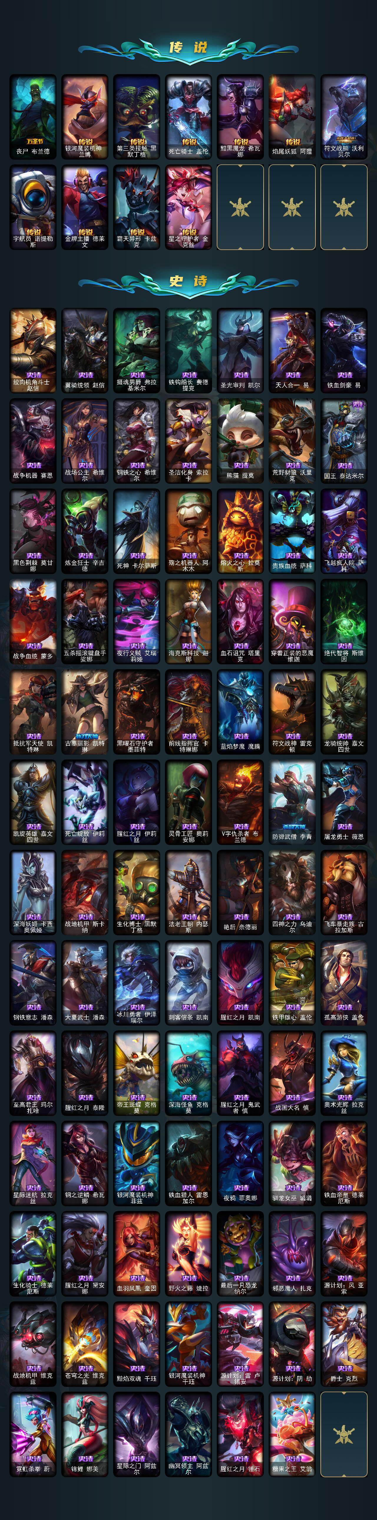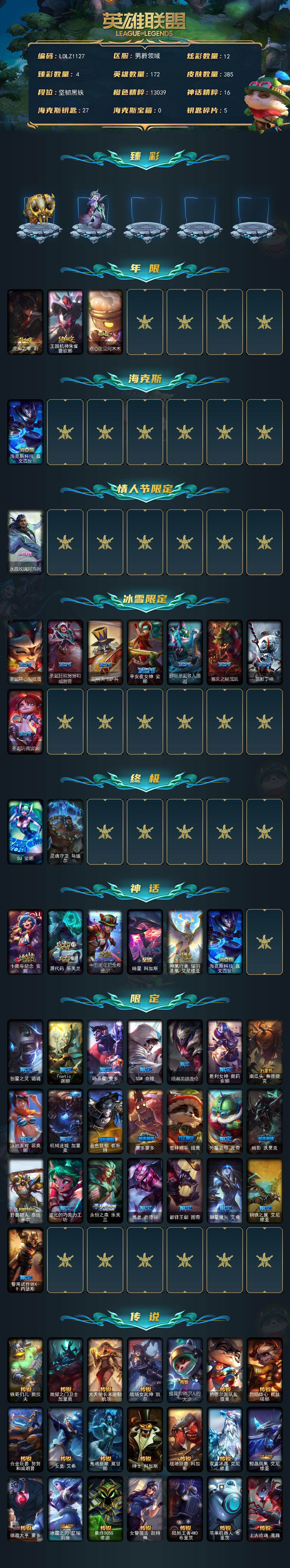 172英雄/385皮肤/2终极/6神话/34限定/4臻彩/12炫彩/32传说/90史诗/未定级/