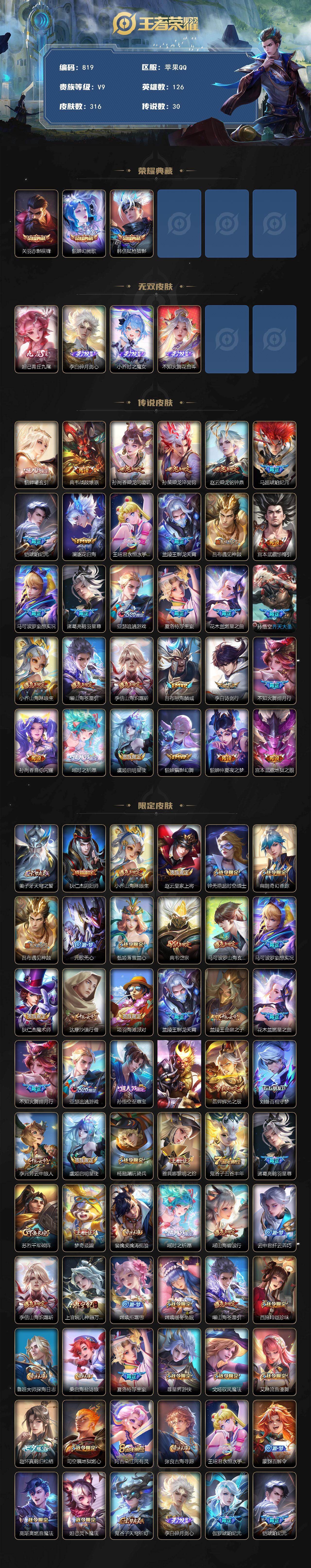 1963526 王者荣耀账号 苹果Q-V9-永恒钻石II段位-126英雄-316皮肤-3典藏皮肤-4无双-30传说-71史诗