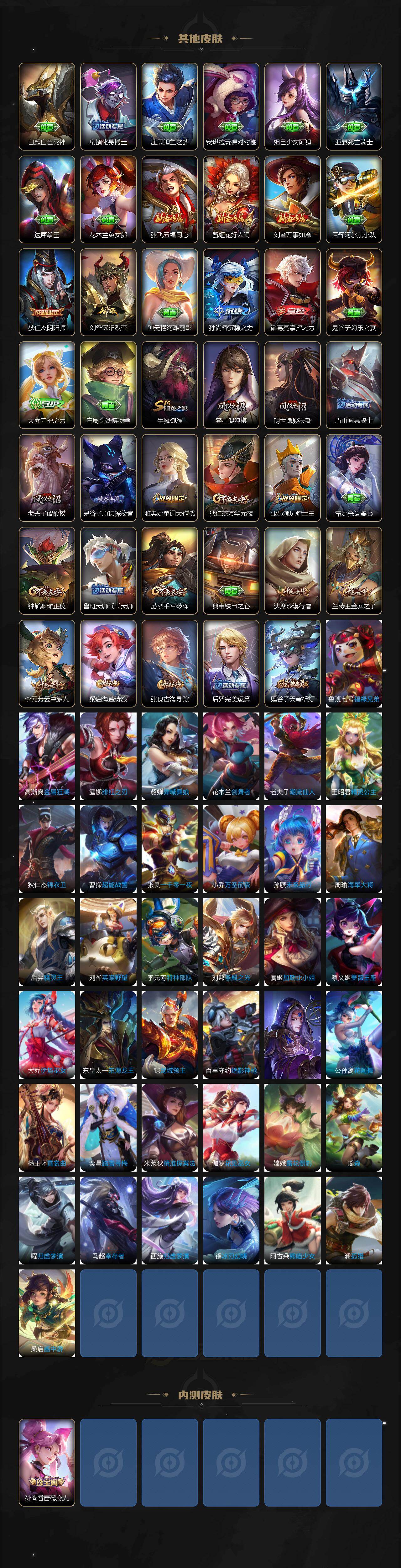 【限定皮肤】:狄仁杰阴阳师,赵云皇家上将,孙尚香蔷薇恋人,孙膑天狼运算者,元歌云间偶戏,狄仁杰魔术师,狄仁杰万华元夜,达摩沙漠行僧,项羽海滩派对,老夫子醍醐杖,兰陵王金庭之子,亚瑟潮玩骑士王,牛魔御旌,李