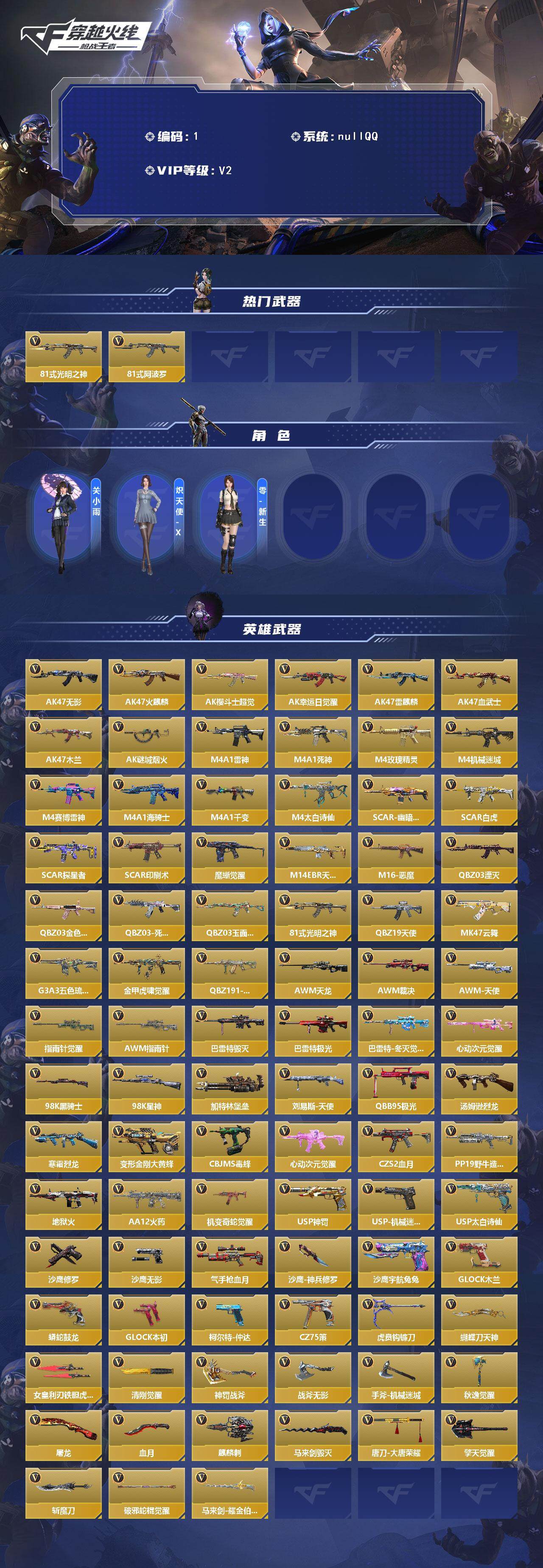 VIP2/139V/81式-光明之神/81式-阿波罗/关小雨/炽天使-X/零-新生/AK47-无影/AK47-火麒麟/AK47-樱斗士-超觉/AK47-幸运日觉醒/AK47-雷麒麟/AK47-血武士/AK47-木兰/AK47-谜城烟火/M4A1-雷神/M4A1-死神/M4A1-玫瑰精灵/M4A1-机械迷城/M4A1-赛博雷神/M4A1-海骑士/M4A1-千变/M4A1-太白诗仙/SCAR-幽暗骑