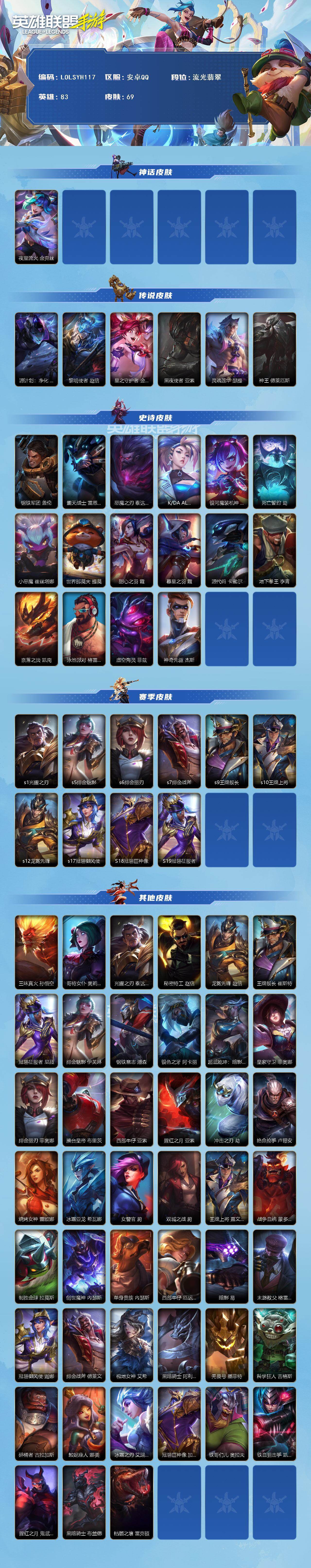 【LOLSYH117】83英雄/69皮肤/流光翡翠/夜星流火 金克丝/源计划:净化 薇恩/黎明使者 赵信/星之守护者 金克丝/黑夜使者 亚索/灵魂莲华 瑟提/神王 德莱厄斯/钢铁军团 盖伦/霸天战士 雷恩加尔/恶魔之刃 泰达米尔/K/DA ALL OUT 阿卡丽/银河魔装机神 安妮/死亡誓约 劫/小恶魔 崔丝塔娜/世界那莫大 提莫/甜心之羽 霞/暮星之羽 霞/源代码 卡蜜尔/地下拳王 李青/奈落之炎 凯南/泳池派对 格雷福斯/虚空海灵 菲兹/神奇先驱 杰斯/s1光耀之刃/s5绯金魅影/s6绯金丽
