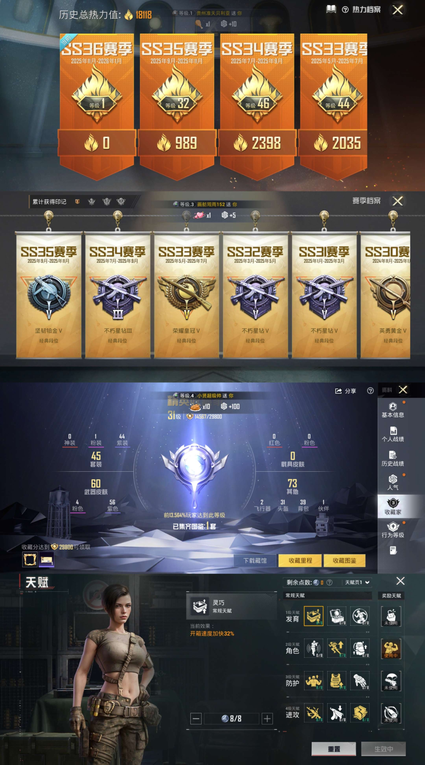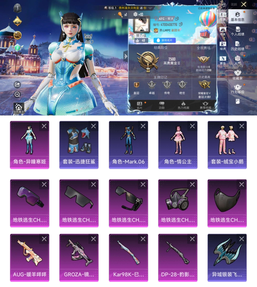 素材一体号97皮7传说 地铁满天赋【可二次-1粉装-4特效枪-异瞳寒姬 蓝螳螂 Mark.06 蓝冰羽 恋语绒绒 迅捷狂鲨-地铁已开-王者97皮7传说】18118热力值-45套装-69枪皮【特效枪等级】:AUG-暖羊咩咩(五级- AUG-暖羊咩咩)GROZA-镜光银凌(五级- GROZA-镜光银凌)Kar98K-巳巳如意(五级- Kar98K-巳巳如意)【优质武器皮肤】: AU