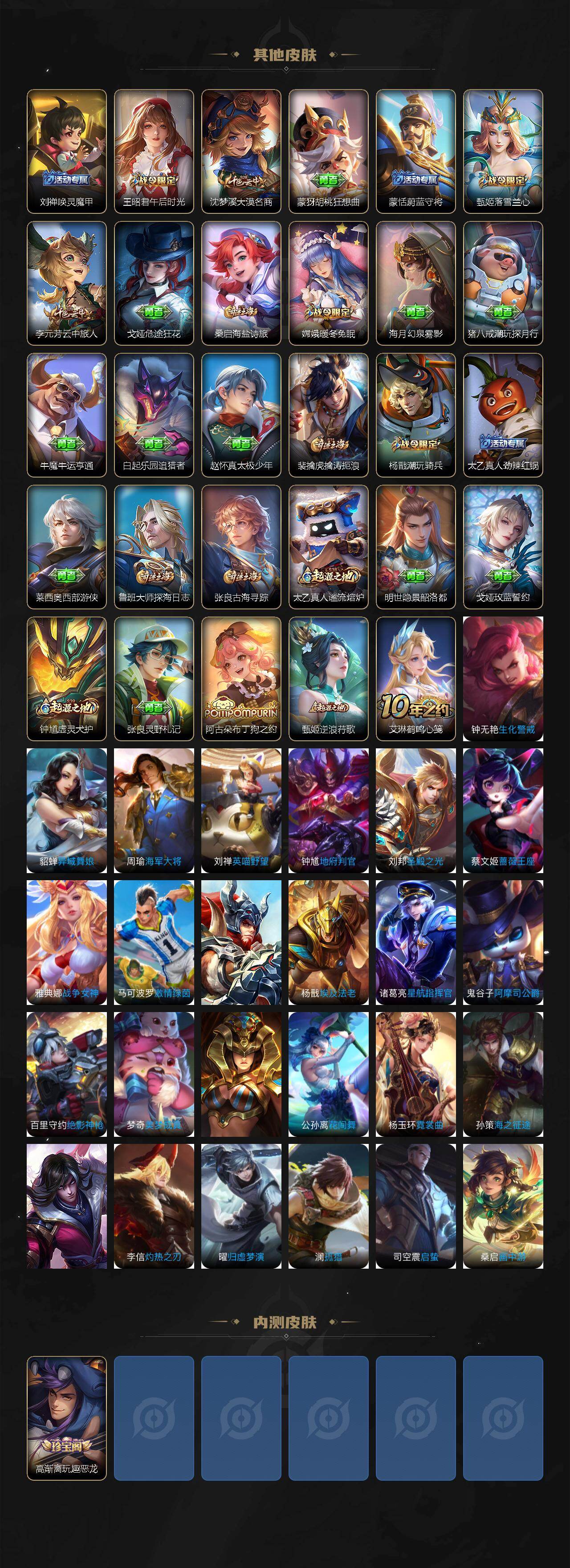 【限定皮肤】:狄仁杰阴阳师,赵云皇家上将,墨子降魔,鲁班七号寅虎瑞焰,庄周高山流水,高渐离玩趣恶龙,钟无艳超时空战士,扁鹊奇