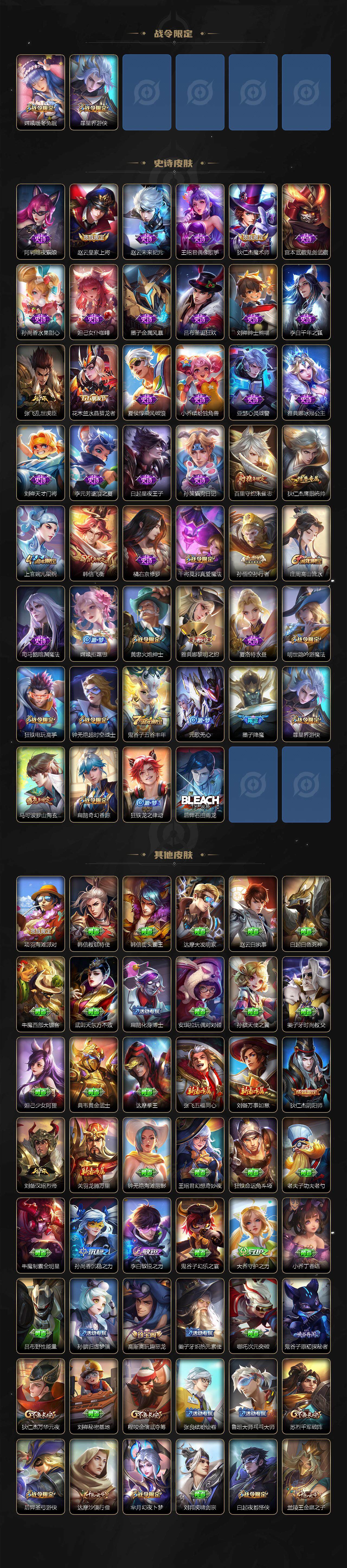 【传说皮肤】:后羿神树通天,吕布怒海麟威,李白诗剑行,不知火舞绯月行,鲁班七号寅虎瑞焰,曜李逍遥 ,曜云鹰飞将,李信一念神魔