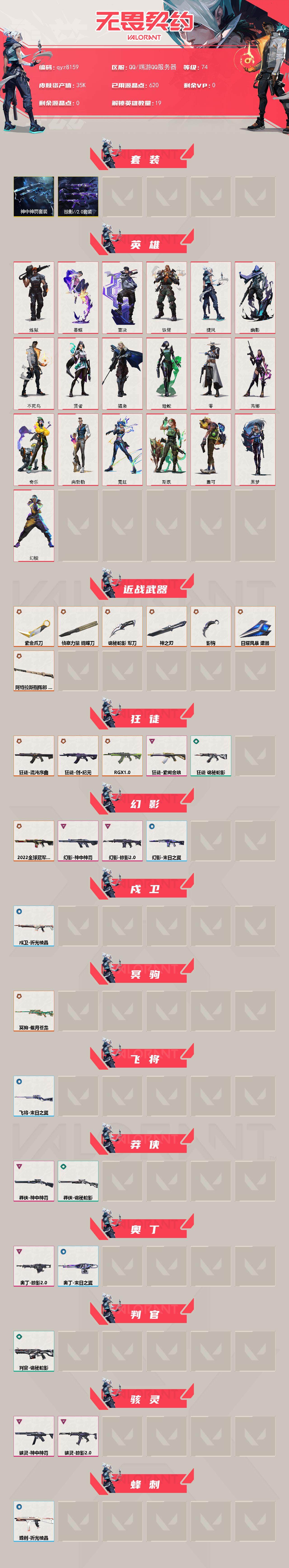 【qyz8159】22冠军幻影 掠影2.0套 神中神罚套 混沌显卡创纪元狂徒 qyz8159 亮点皮肤: 幻影-2022全球冠军赛 套装: 神中神罚套装,掠影2.0套装 近战武器皮肤: 蝴蝶刀-侦察力量,紫金爪刀,诡秘蛇影,神之刃,影钩 步枪皮肤: 狂徒-紫阙金琅,狂徒-混沌序曲,狂徒-创·纪元,幻影-神中神罚,狂徒-RGX 11z pro,幻影-掠影2.0 佩枪皮肤: 鬼魅-耀鳞威龙,正义-掠影,标配-VCT25xAG,狂怒-神中神罚,鬼魅-掠影2.0 狙击枪皮肤: 冥驹-偃月苍龙,莽侠-