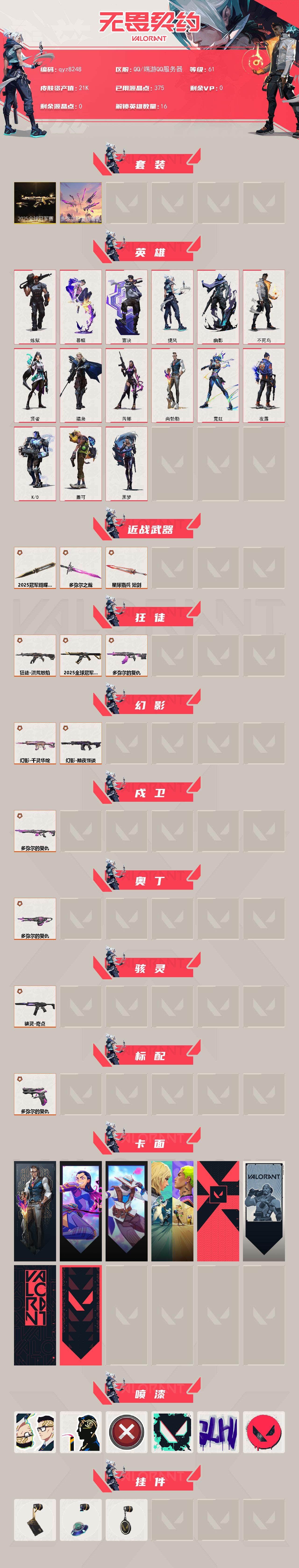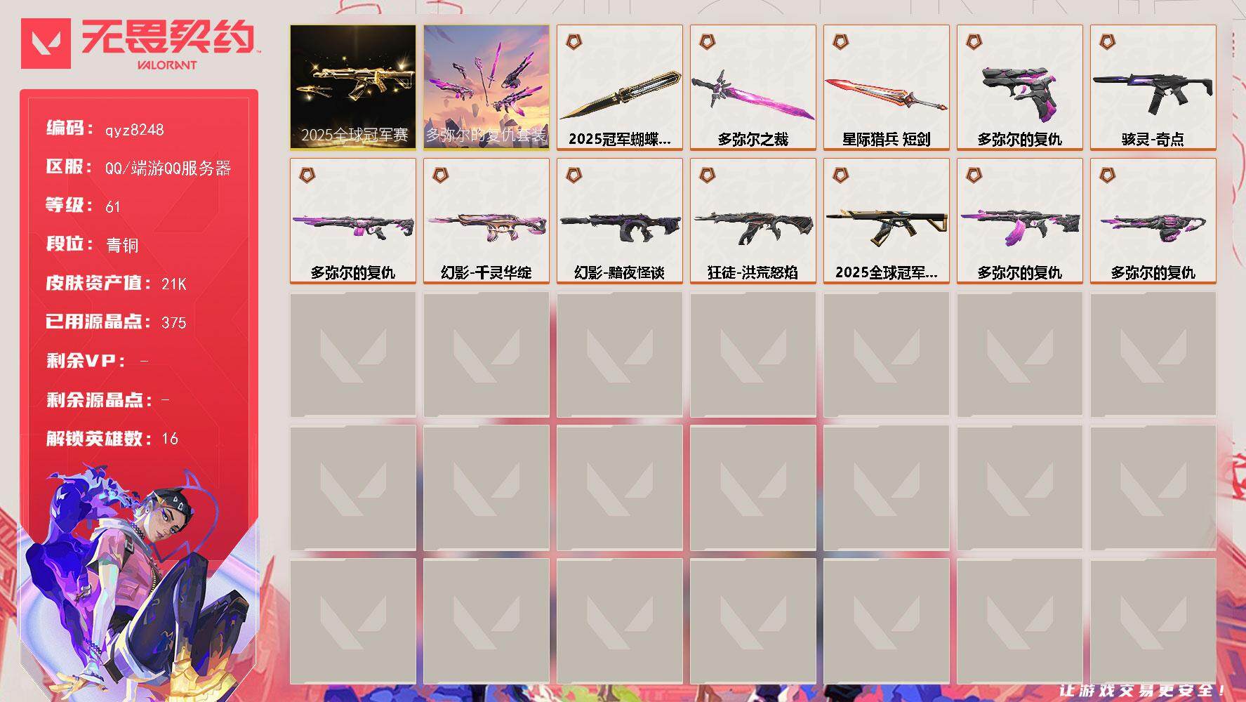 【qyz8248】碎心裂刃 黯夜怪谈幻影 奇点骇灵 洪荒怒焰狂徒 多弥尔的复仇套装 25冠军套 千灵幻影 qyz8248 套装: 2025全球冠军赛,多弥尔的复仇 近战武器皮肤: 2025全球冠军赛 蝴蝶刀,多弥尔之裁 步枪皮肤: 狂徒-洪荒怒焰,幻影-千灵华绽,幻影-黯夜怪谈,2025全球冠军赛 狂徒,多弥尔的复仇 狂徒,多弥尔的复仇 戍卫 佩枪皮肤: 多弥尔的复仇 标配 冲锋枪皮肤: 骇灵-奇点 机枪皮肤: 多弥尔的复仇 奥丁 亮点: 【qyz8248】【套装】:2025全球冠军赛套装,多