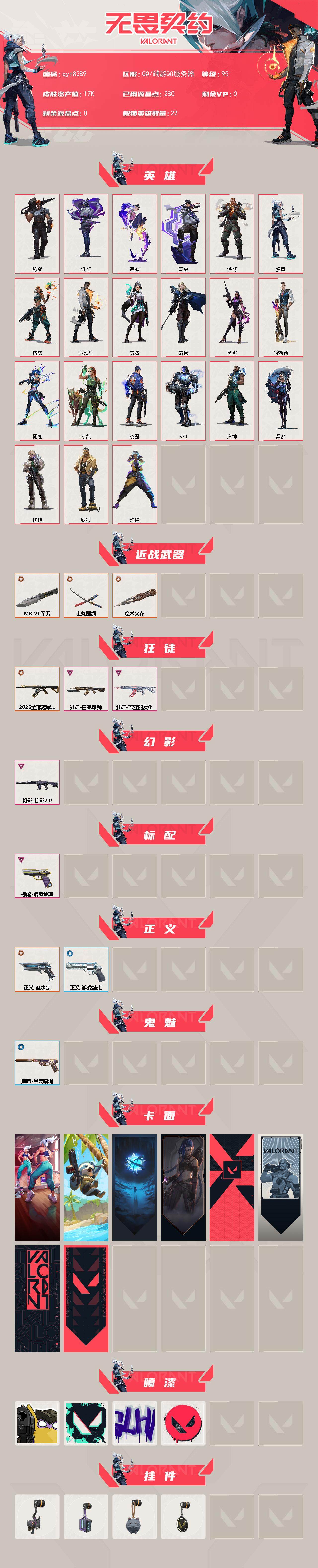 【qyz8389】铂金极品号 速出 qyz8389 近战武器皮肤: MK.VII自由强袭军刀,鬼丸国纲,魔术火花 步枪皮肤: 狂徒-盖亚的复仇,狂徒-日冕雄师,幻影-掠影2.0,2025全球冠军赛 狂徒 佩枪皮肤: 标配-紫阙金琅,正义-塑水宗 亮点: 【qyz8389】【英雄】:幻棱,炼狱,维斯,暮蝶,钛狐,壹决,铁臂,捷风,雷兹,不死鸟,贤者,猎枭,芮娜,尚勃勒,霓虹,斯凯,夜露,K/O,海神,黑梦,钢锁【近战武器】:近战武器-魔术火花,近战武器-鬼丸国纲,近战武器-MK.VII 自由强袭
