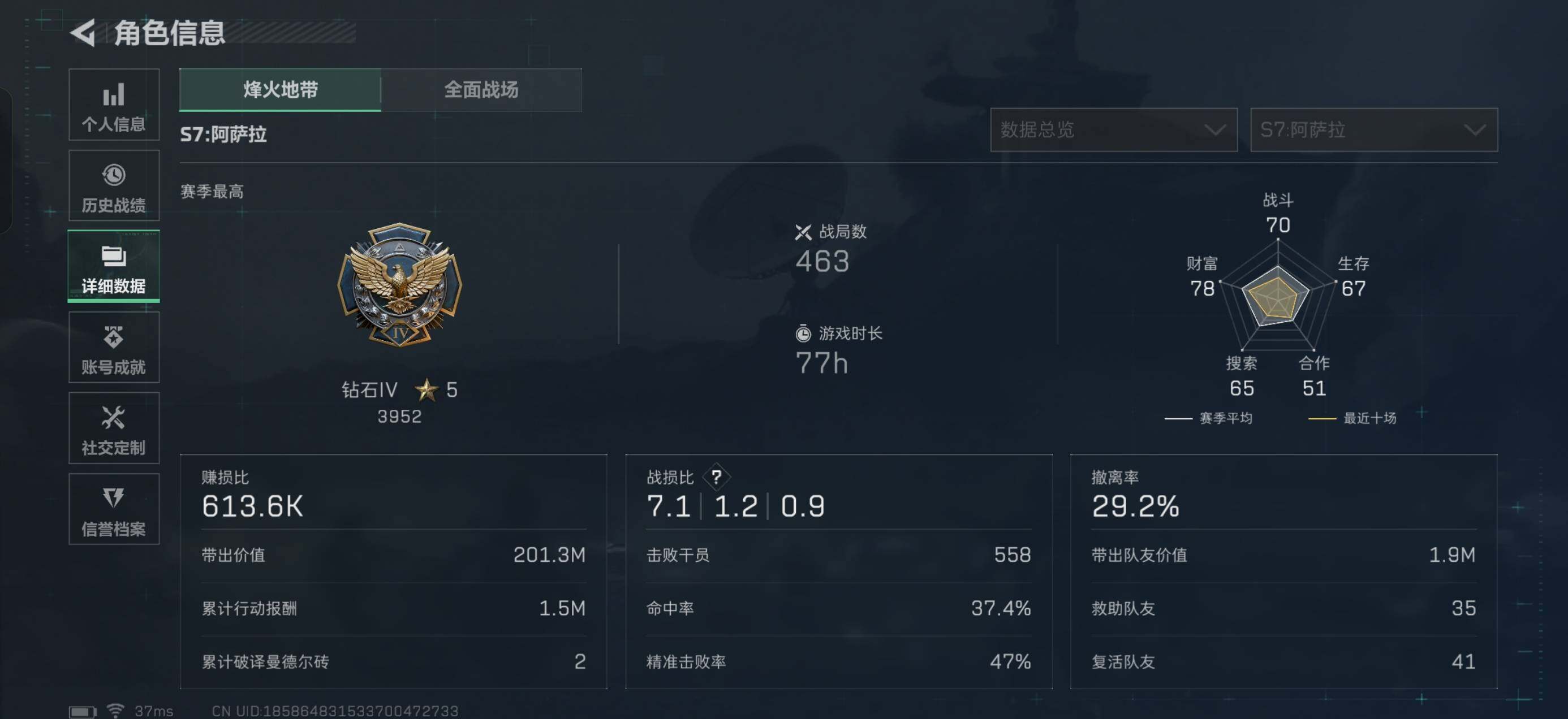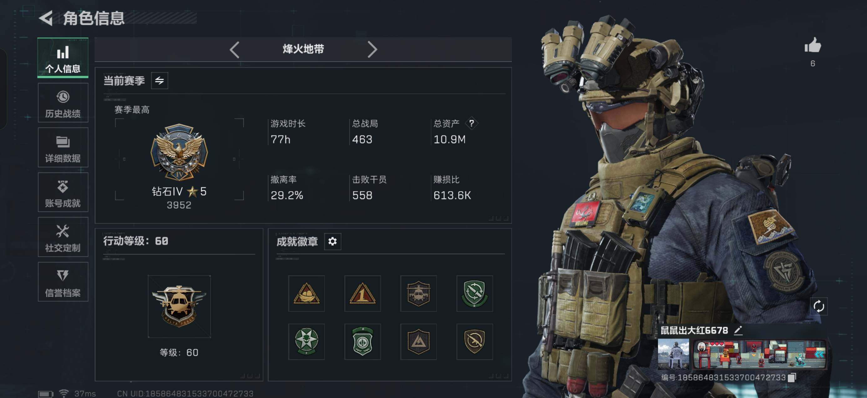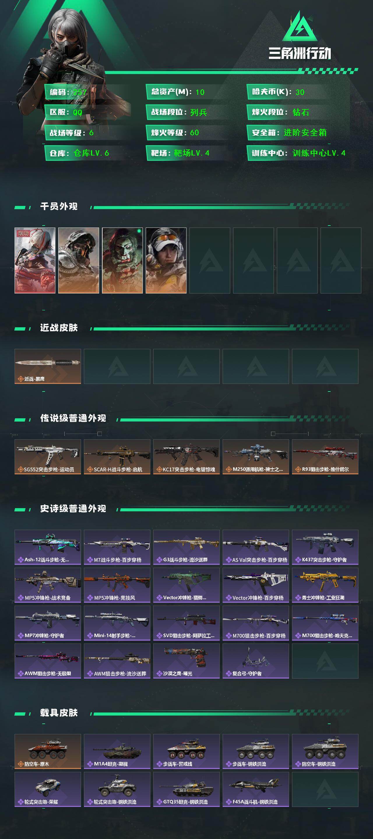 10m总资产-30k哈伏币-60烽火等级-钻石-6战场等级-列兵