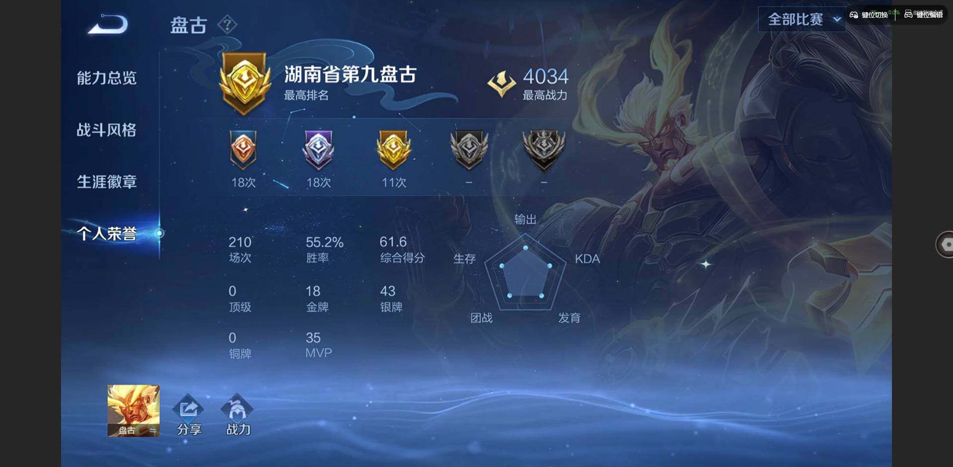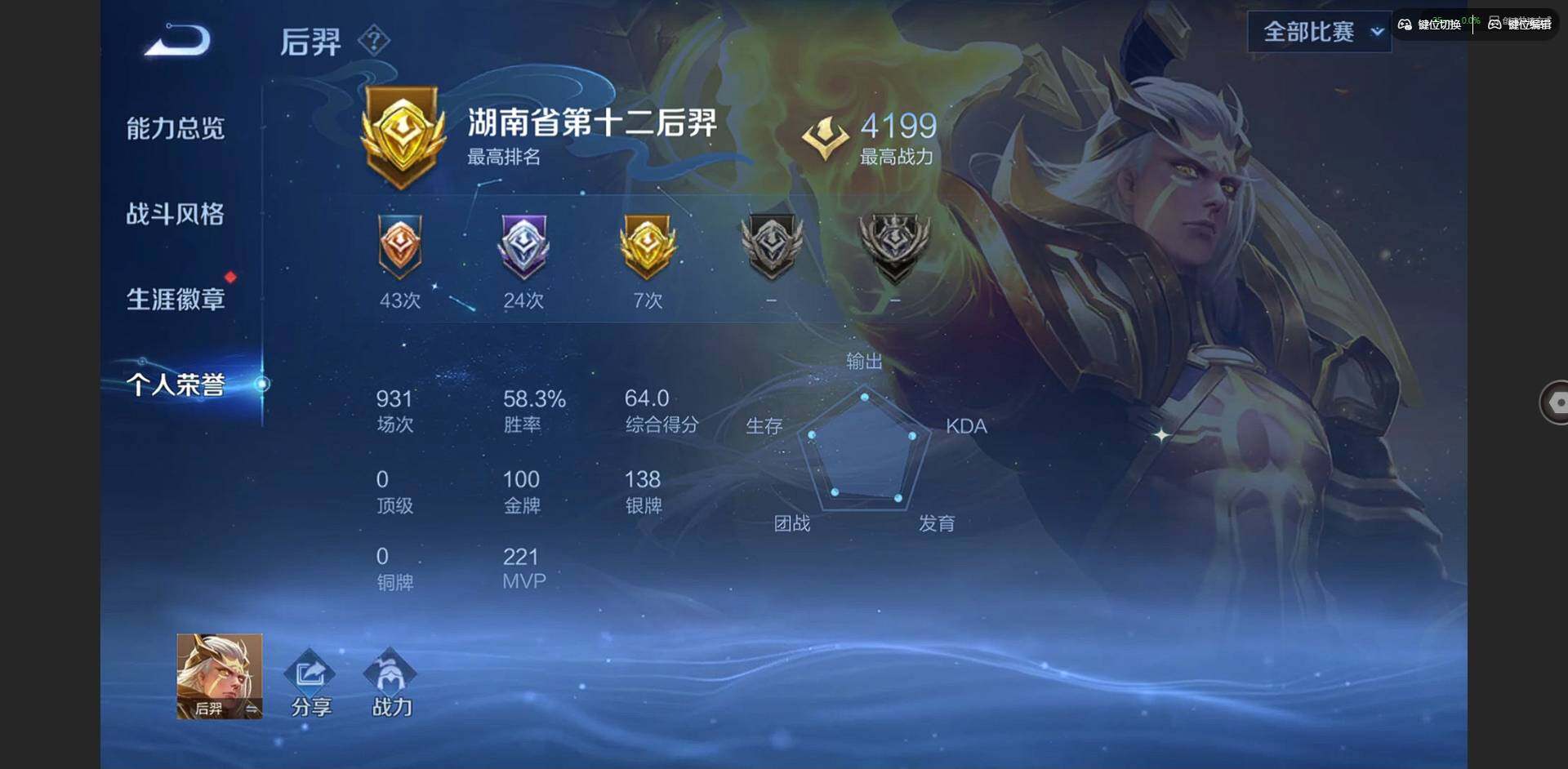 [金标后羿 金标盘古]实名: 可修改 贵族等级: V7 英雄数: 123 皮肤数: 101 荣耀水晶: 全息碎影 传说皮: 黄金射手座,黄金白羊座,末日机甲-孙尚香,超时空战士-狄仁杰,神树通天 限定皮: 李小龙,梁祝,梅西,大圣娶亲,诗剑行,鸣野蒿
