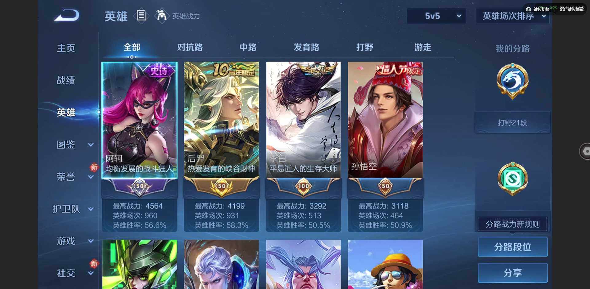 [金标后羿 金标盘古]实名: 可修改 贵族等级: V7 英雄数: 123 皮肤