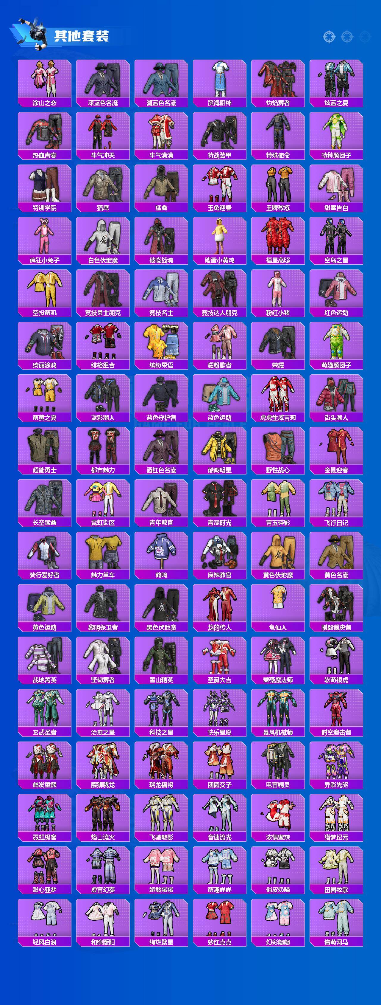 【粉色套装】:粉装-梦幻火箭,粉装-冰霜白皇,粉装-炙焰红王,粉装-暗翼战神,粉装-暗夜玫瑰,粉装-垂柳戏鸭,粉装-飒粉甜心,角色-圣堂之誓,角色-樱桃泡泡,角色-异瞳寒姬