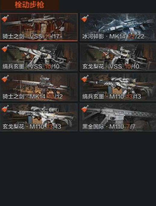 【紫色枪皮】 和平之手·FAL 火绒草·AUG 玄戈梨花·M110 山地伪装·AK74N 林地数码·T03 骑士之剑·MK14 骑士之剑·ACE31 来战·AKM 来战·AK74N 自喷网格·H416 竞技·M4A1 北国内卫·AN94 北国内卫·MDR 无畏·USAS12 缟兵玄墨·AKM 玄戈梨花·T03 缟兵玄墨·T0