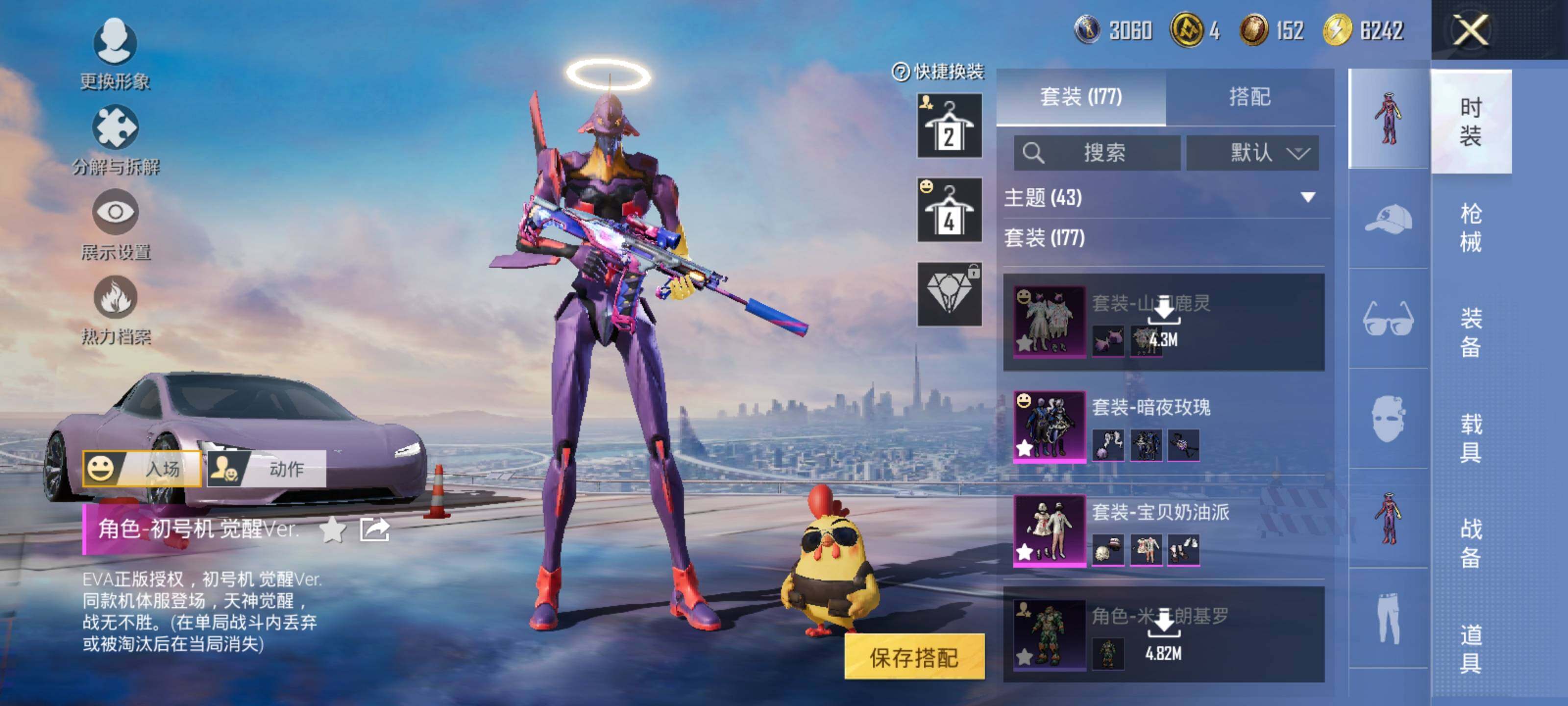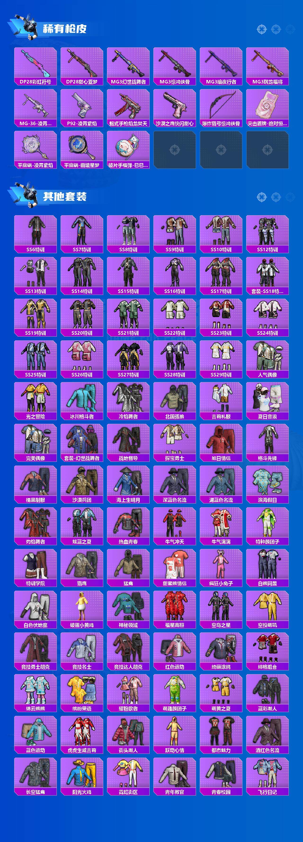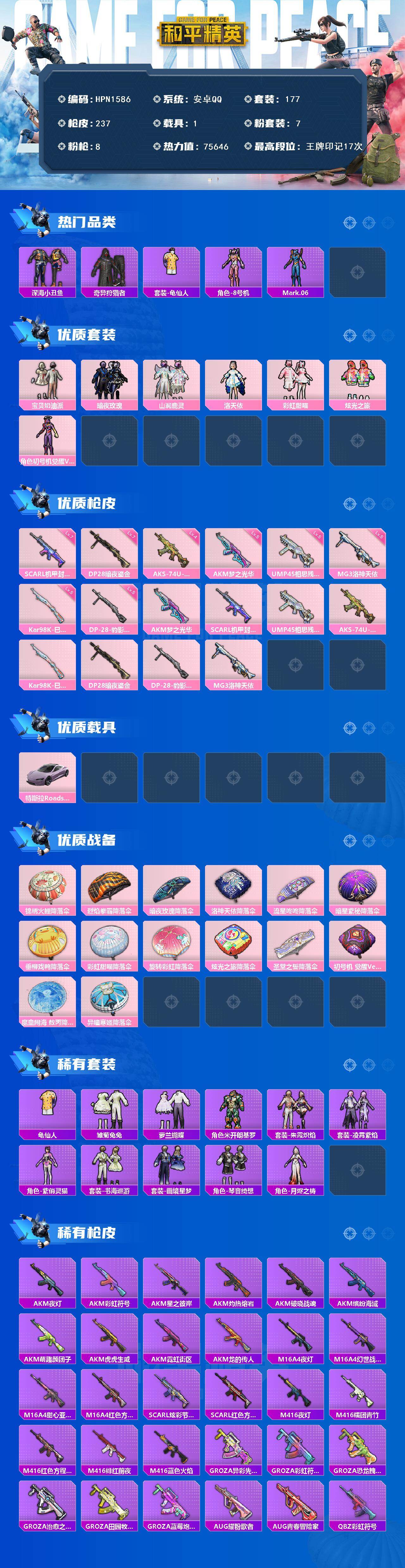 【HPN1586】177套装/枪械8/装备274/载具1/战备188/王牌印记17/热力值75646/五级AKM-梦之光华/七级SCAR-L-机甲封神/五级UMP45-相思残雪/四级AKS-74U-森灵之息/五级Kar98K-巳巳如意/七级DP-28-暗夜鎏金/五级DP-28-豹影疾电/五级MG3-洛神天依/深海小丑鱼/奇异狩猎者/套装-龟仙人/角色-8号机/角色-Mark.06/宝贝奶油派/暗夜玫瑰/山涧鹿灵/洛天依/彩虹甜喵/炫光之旅/Famas-初号机 觉醒Ver./特斯拉Roadster