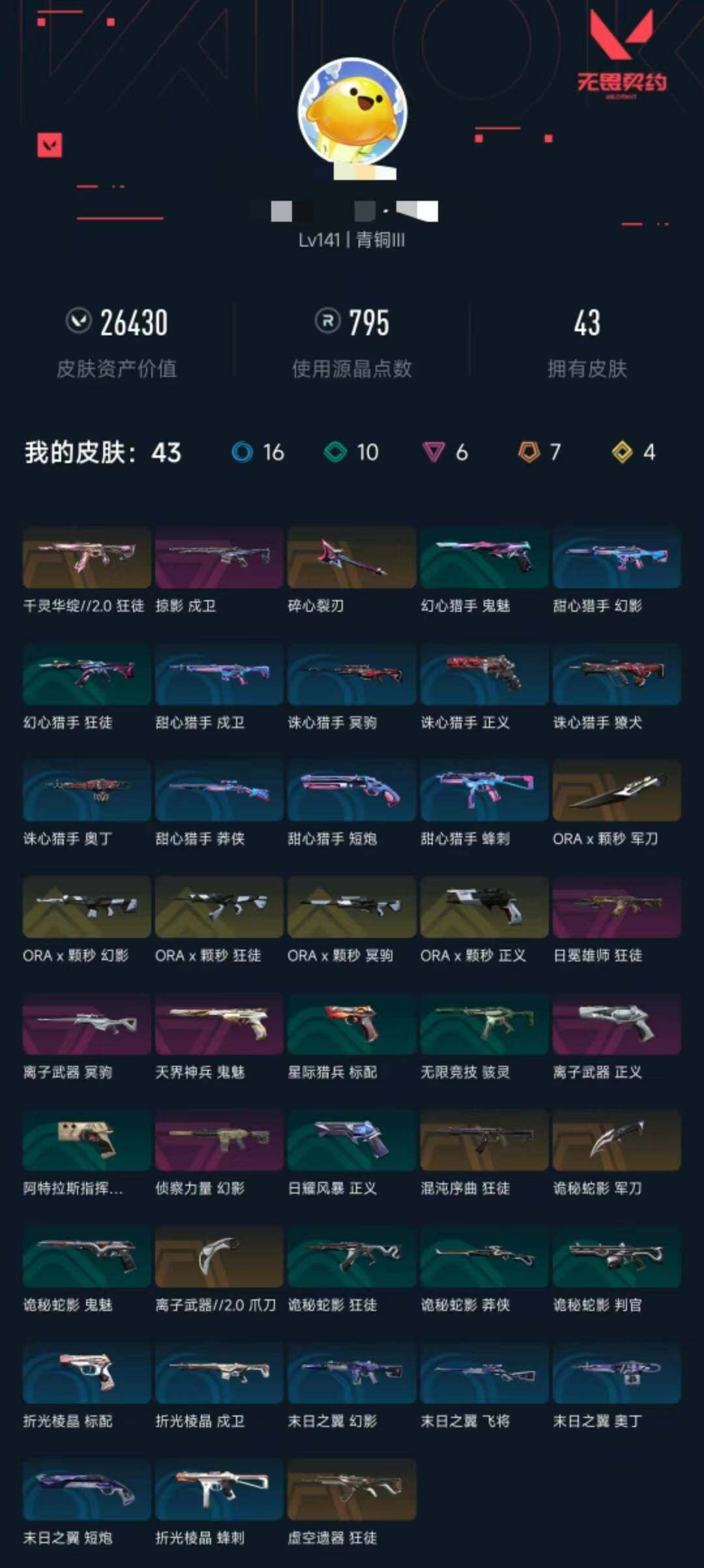 【WWN381】终极*7/传奇*4/卓越*6/皮肤*43/等级*141/段位:青铜/ORA x 颗秒套装/幻棱/炼狱/维斯/暮蝶/钛狐/壹决/铁臂/捷风/雷兹/幽影/不死鸟/贤者/猎枭/蝰蛇/零/芮娜/奇乐/尚勃勒/霓虹/斯凯/夜露/星礈/K/O/盖可/黑梦/钢锁/近战武器-ORA x 颗秒 军刀/近战武器-离子武器//2.0 爪刀/近战武器-诡秘蛇影 军刀/狂徒-混沌序曲/狂徒-虚空遗器/狂徒-ORA x 颗秒/狂徒-千灵华绽//2.0/狂徒-日冕雄师/狂徒-诡秘蛇影/幻影-ORA x 颗秒/