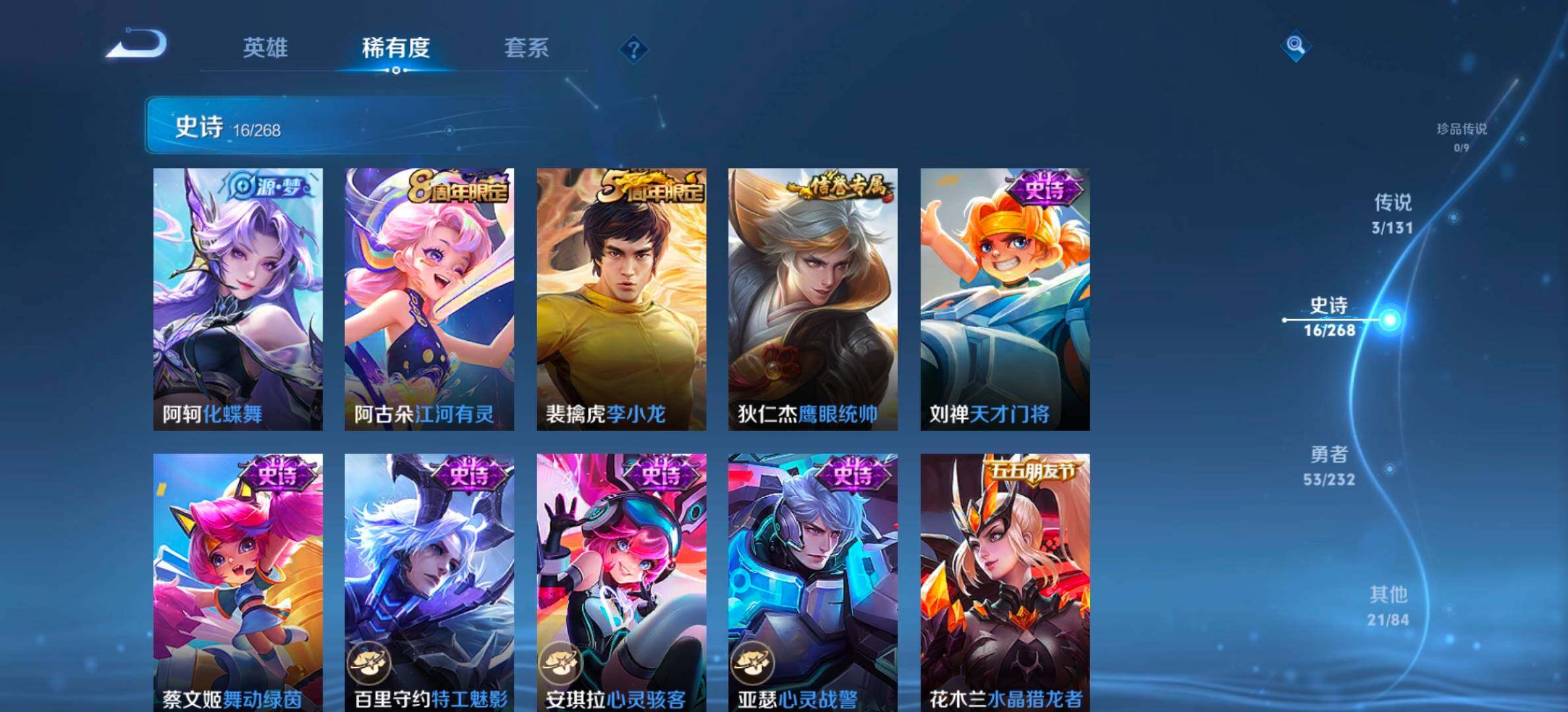 【限定皮肤】:姜子牙天穹之誓,狄仁杰阴阳师,裴擒虎李小龙,裴擒虎擒涛扼浪,鲁班大师探海日志,桑启海盐诗旅,阿古朵江河有灵,张良古海寻踪,鬼谷子天穹祈灯,沈梦溪龙舞盛年,刘邦剑破天穹,刘备异域游侠,周瑜熔金海岸