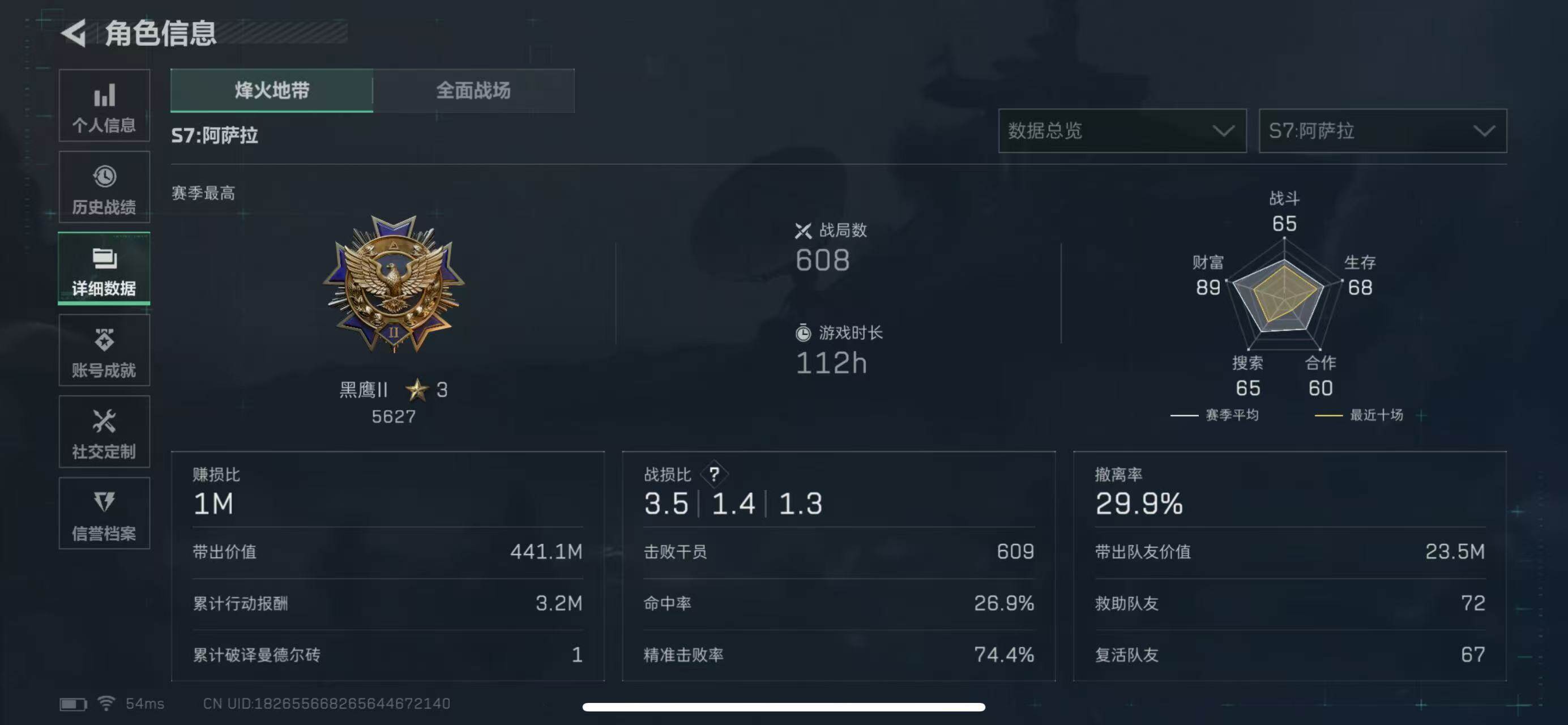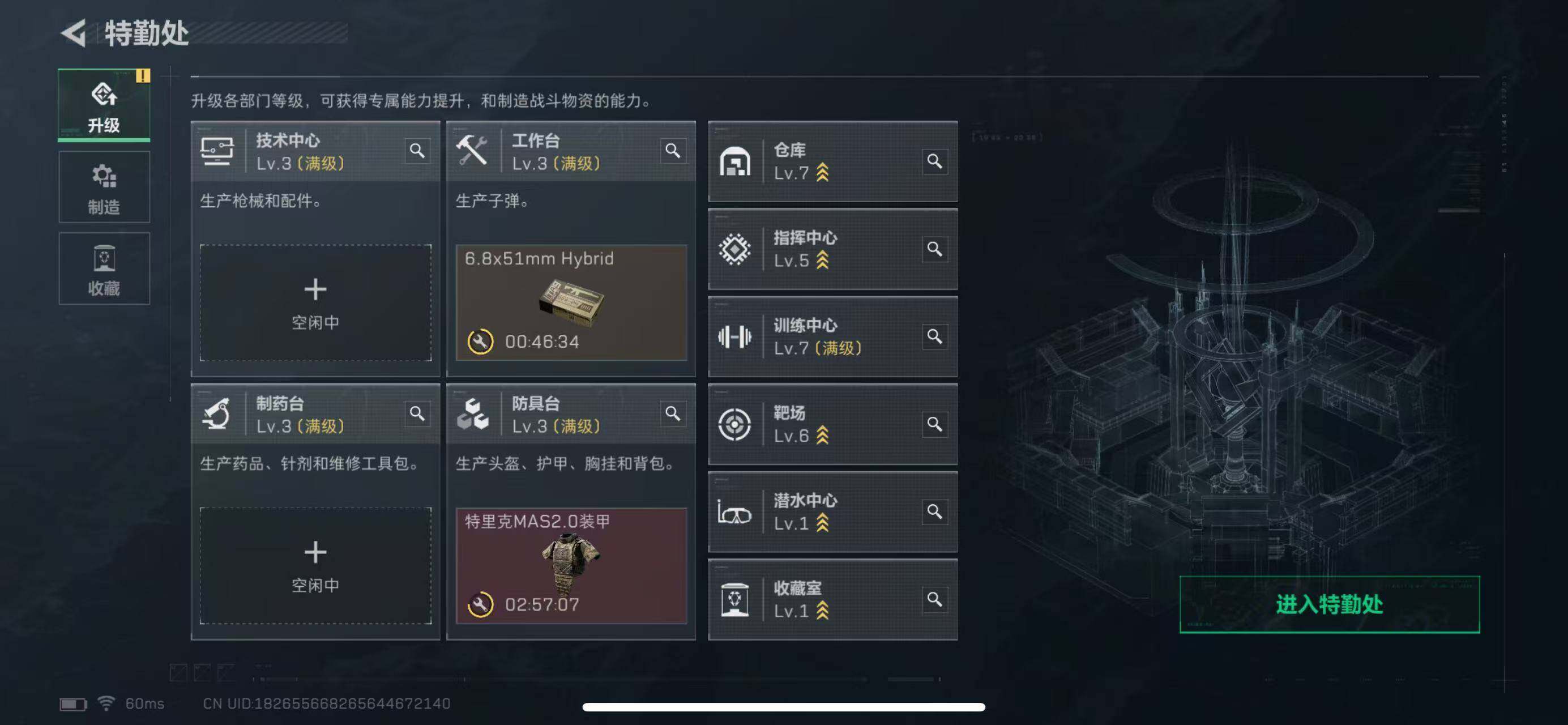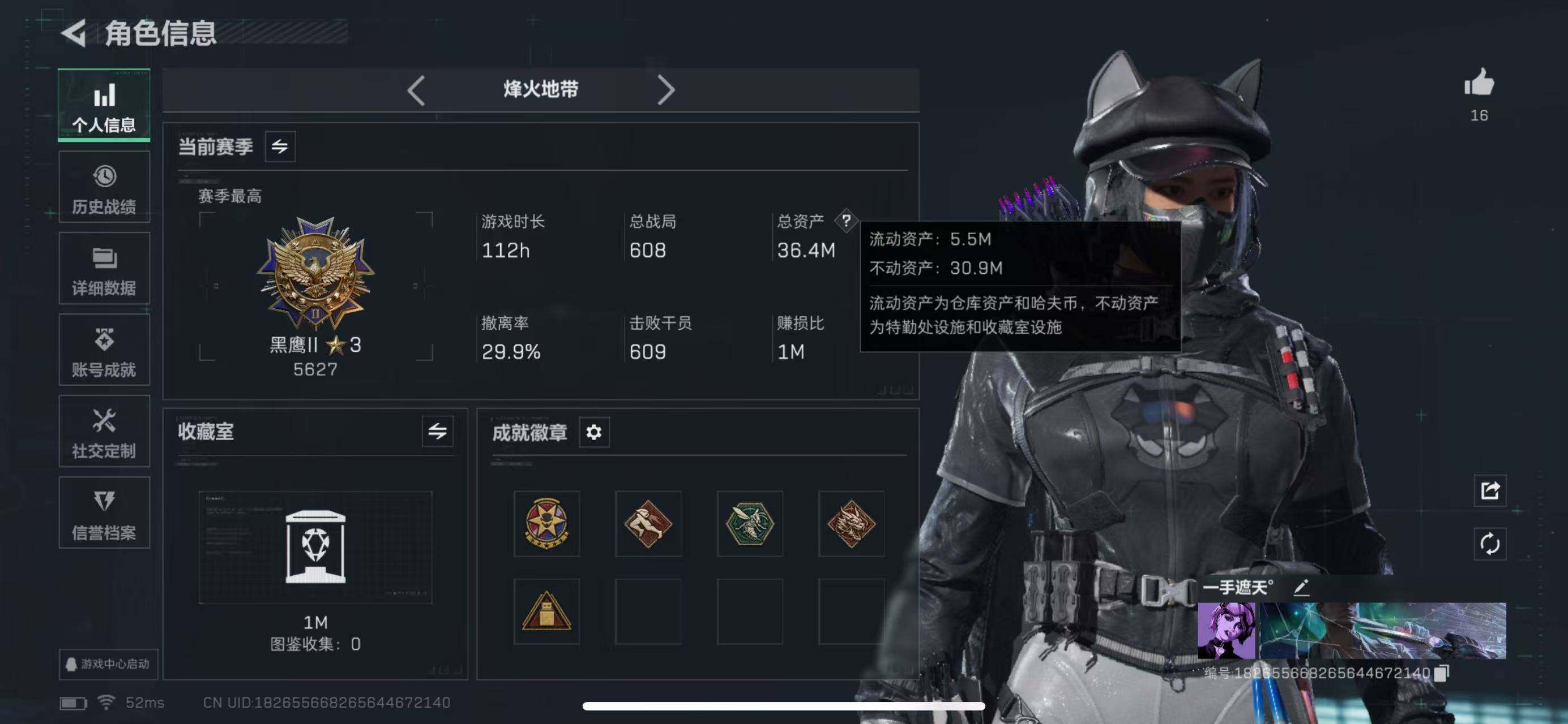 行动等级:60 总资产:36M 哈夫币:0.2W 近战武器:近战武器-北极星 干员皮肤:电锯惊魂,不破誓约,黑·天际线 安全箱:高级安全箱6(2x3)