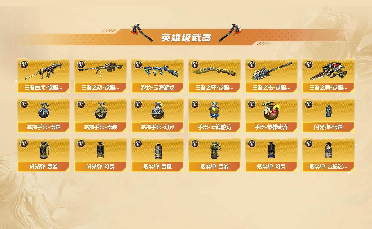 【热门武器】:QBZ03-金色蔷薇*3,M14EBR-玄武,Scar Light-白虎,HK417-朱雀,M4A1-青龙,M200-幻神,死亡之眼,白虎-电玩蓝兔,M4A1-黑骑士*3,汤姆逊-烈龙*6,RPK-盘龙*2,加特林-炼狱*2,雷神-小红*2,COP-白鲨,USP-雷暴*3,COP 357-幻灵*2,沙鹰-修罗*3,金刚伞