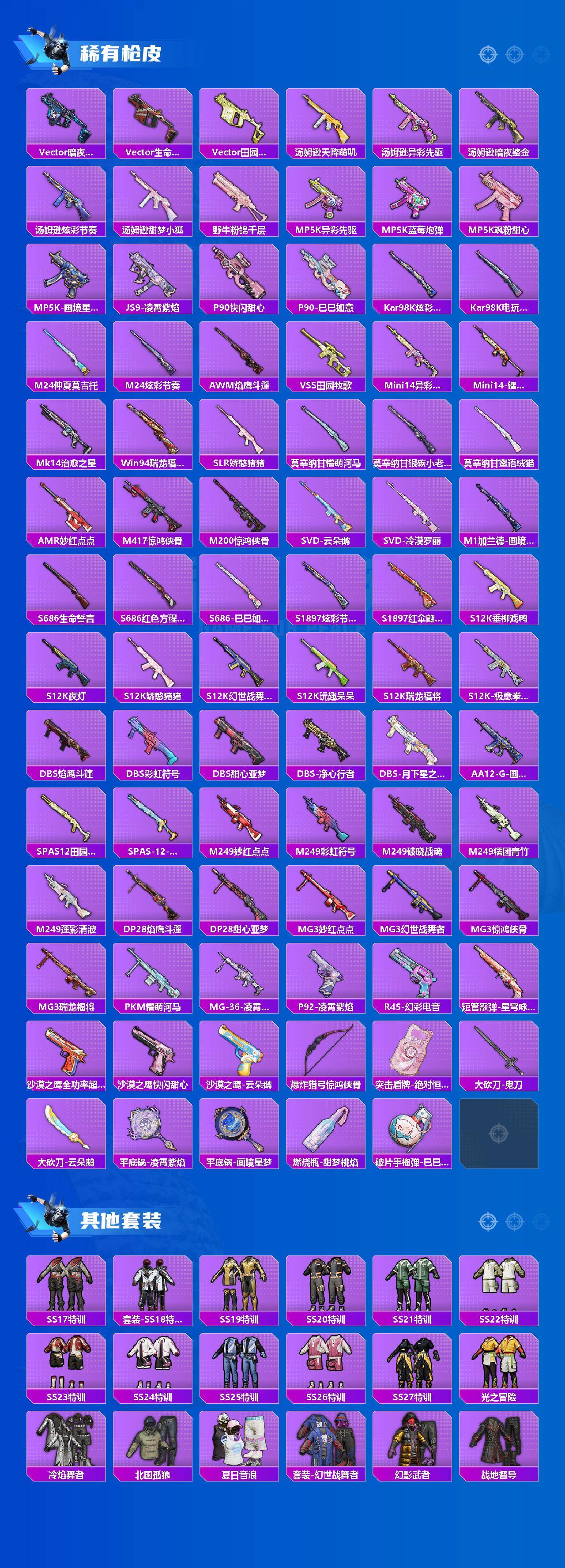 【粉色枪皮等级】:GROZA-镜光银凌(五级),AUG-暖羊咩咩(五级),Kar98K-巳巳如意(五级),Mk14-甜梦熊击(五级),AMR-智耀战神(七级),DP-28-豹影疾电(五级)