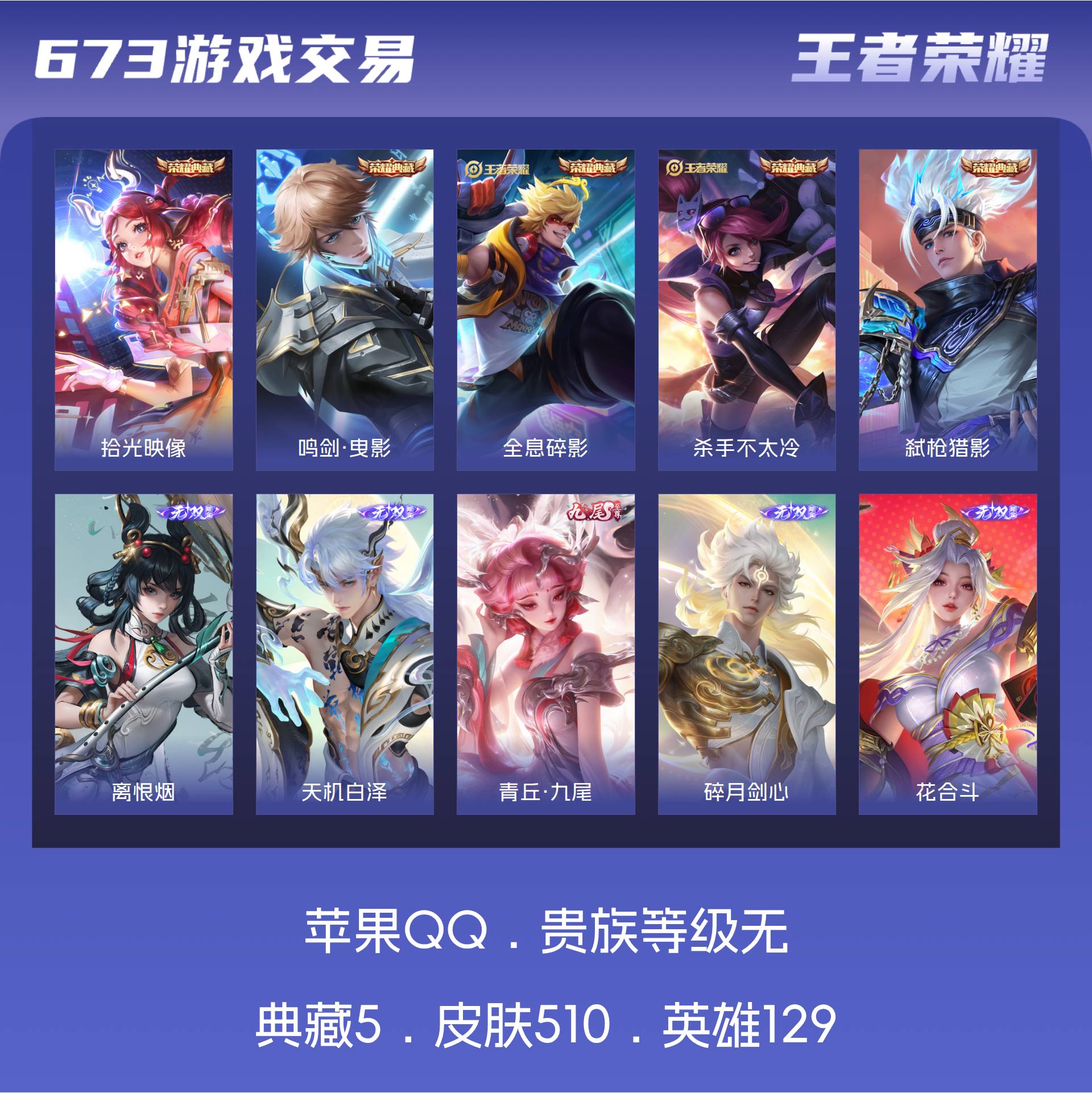 苹果QQ-可二次-皮肤510 英雄129 荣耀典藏5 无双皮肤6 珍品传说3 传说56 其他皮肤444-