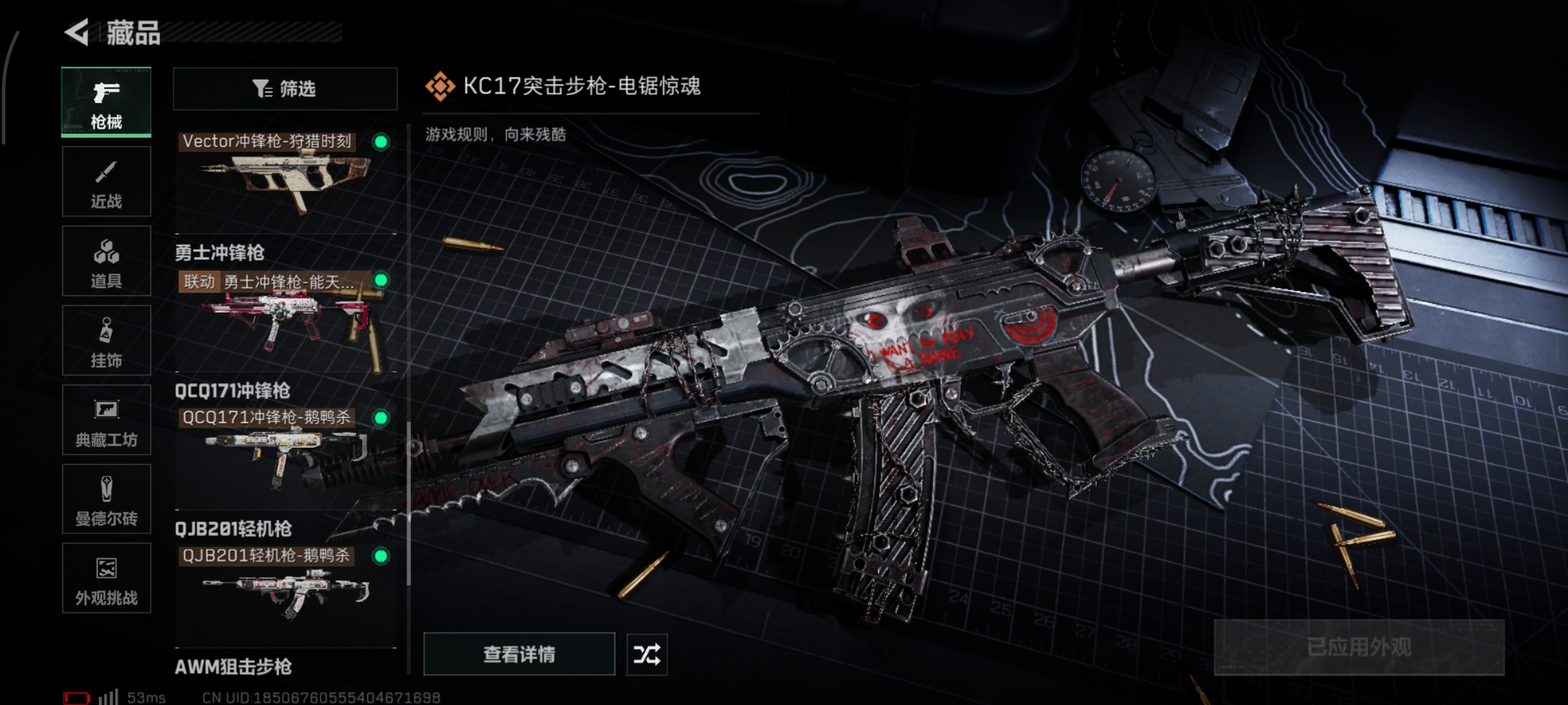 【枪皮】 M4A1突击步枪-阿米娅 ASh-12战斗步枪-鹅鸭杀 M16A4突击步枪-狩猎时刻 SCAR-H战斗步枪-启航 G3战斗步枪-狩猎时刻 腾龙突击步枪-捞点薯条 KC17突击步枪-电锯惊魂 QJB201轻机枪-鹅鸭杀 AWM狙击步枪-捞点薯条 93R-捞点薯条