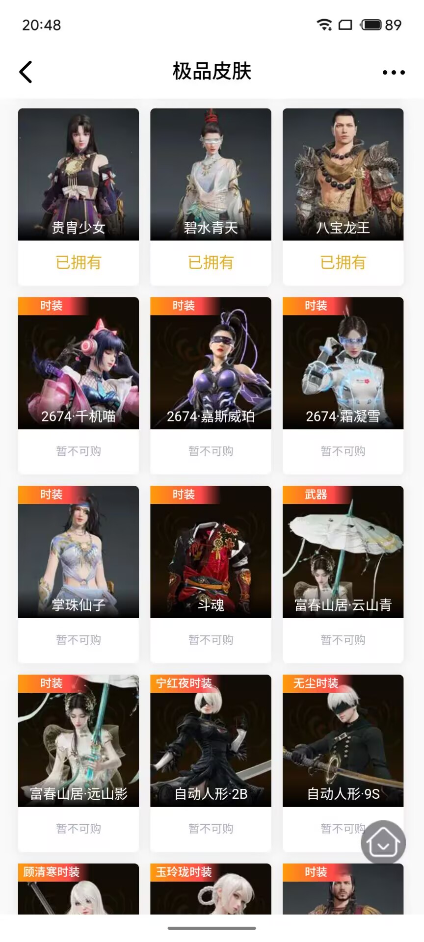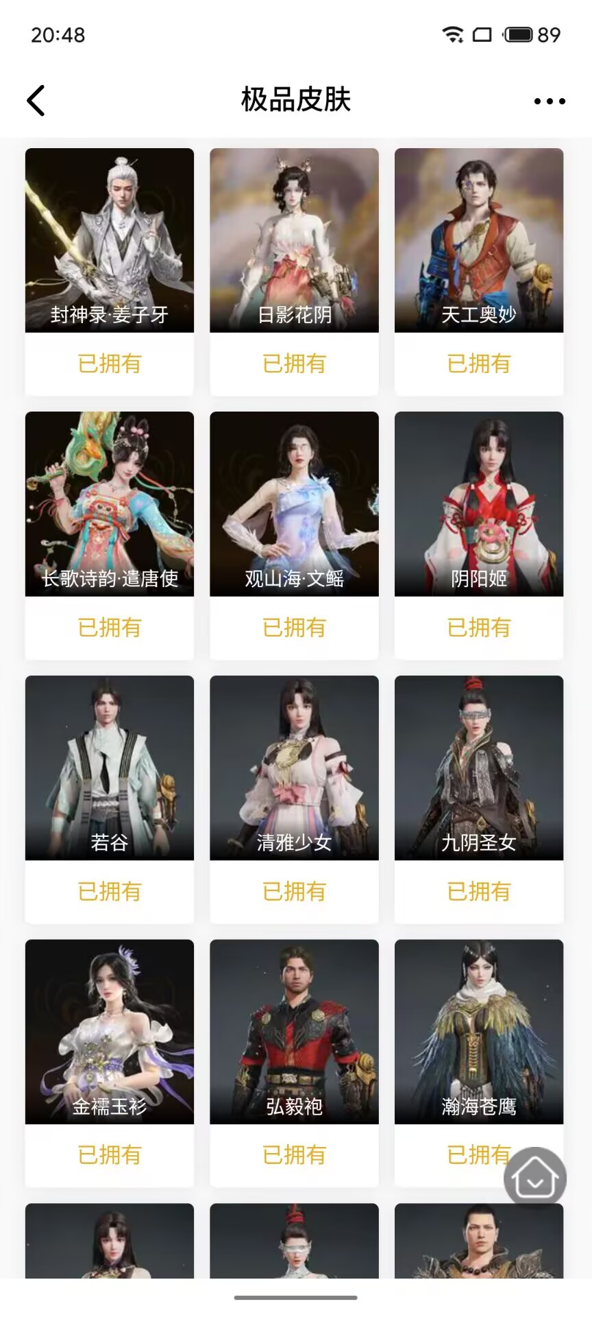 【极品皮肤】 天虹咏 开辟鸿蒙·风雨谐 护世四法·持国天王 护世四法·多闻天王 封神录·申公豹 封神录·姜子牙 天工奥妙 日影花阴 斗罗大陆·唐三 司天命 绮云衫 长歌诗韵·遣唐使 观山海·文鳐 碧水青天 八宝龙王 阴阳姬 九阴圣女 贵胄少女 金襦玉衫 瀚海苍鹰