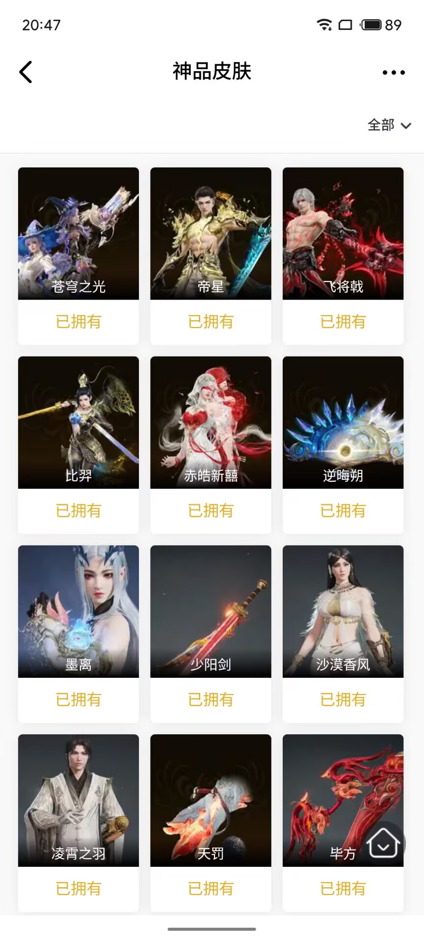 【神品皮肤】 苍穹之光 帝星 赤皓新囍 飞将戟 比羿 逆晦朔 墨离 少阳剑 沙漠香风 凌霄之羽 天罚 毕方
