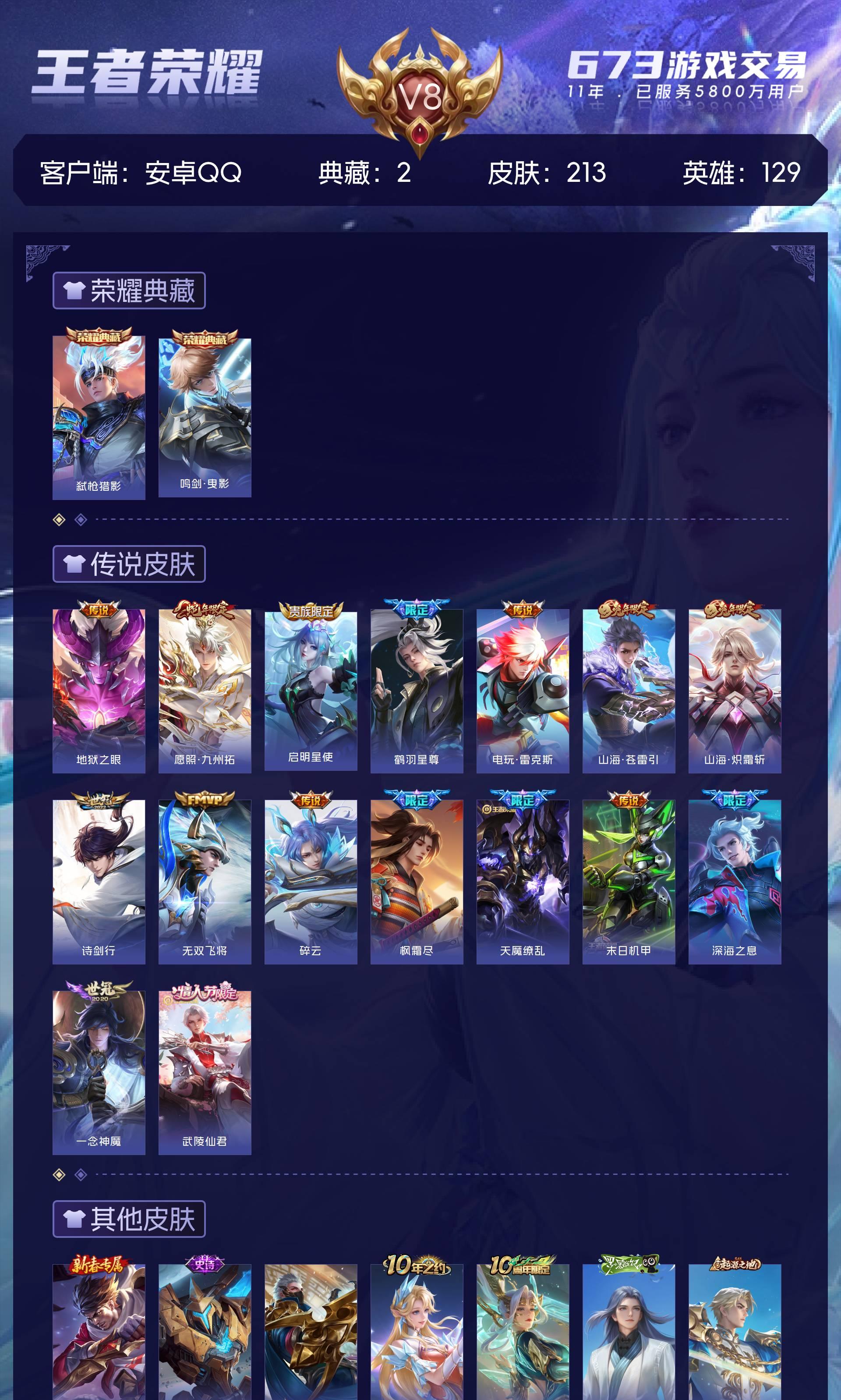 V8 皮肤213 英雄129 至尊星耀 荣耀典藏2 传说17 其他皮肤200