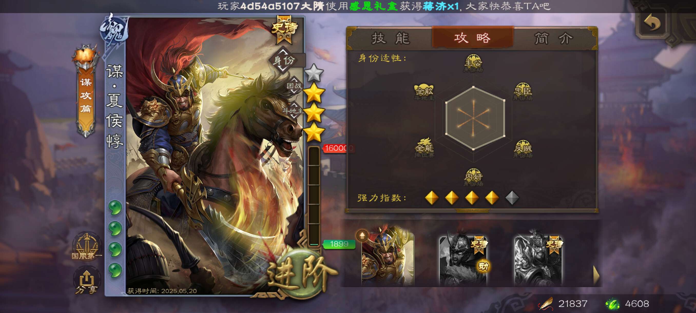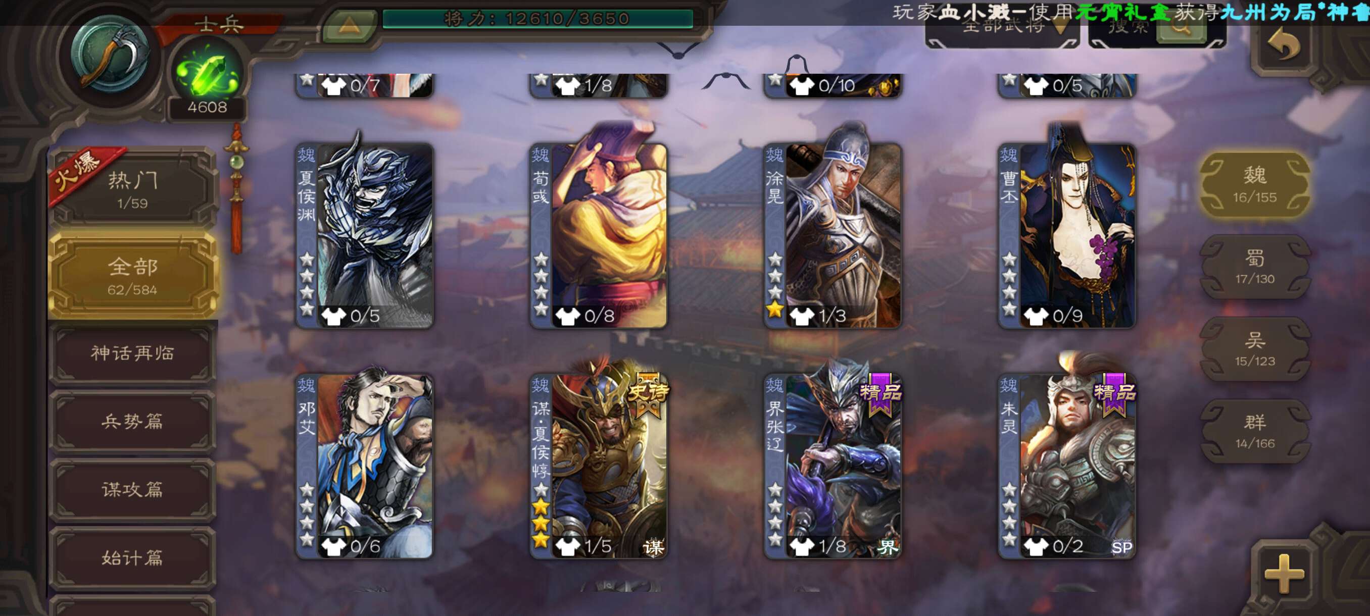 谋夏侯惇+66宝珠超级士兵开局号!总将62,材料充足,官服字母格式活绑