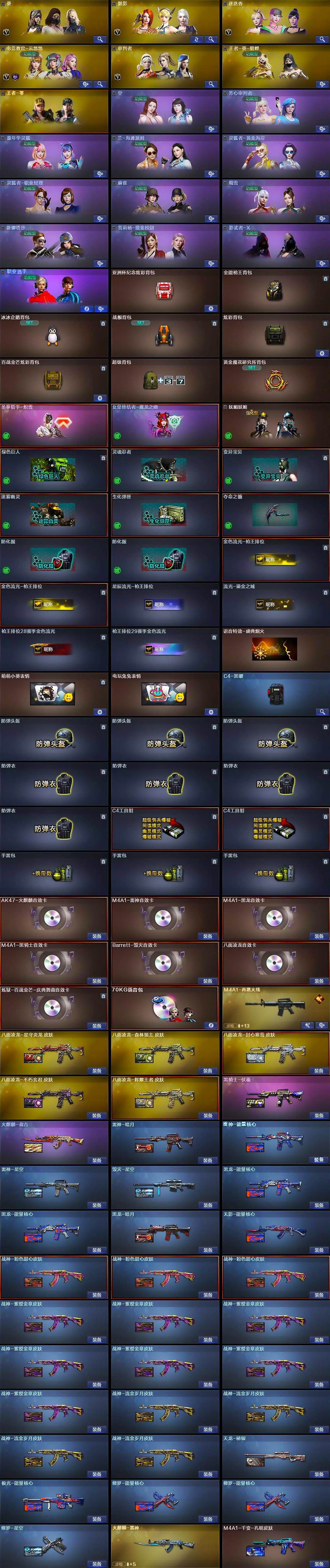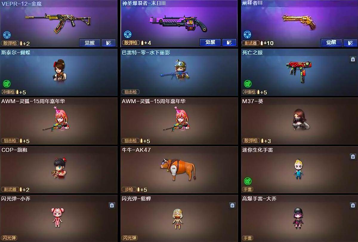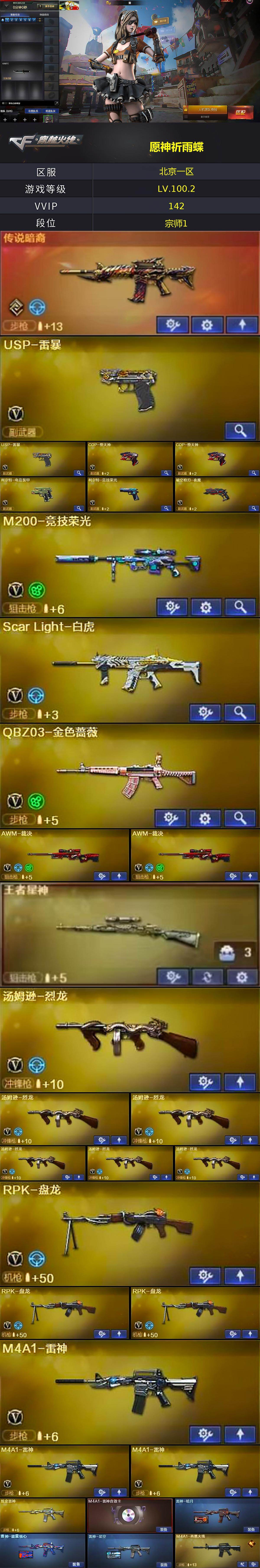 【热门武器】:传说暗裔,王者星神,QBZ03-金色蔷薇,Scar Light-白虎,HK417-朱雀,M200-竞技荣光,八面凌龙,死亡之眼,金色小号,牛牛-AK47,M4A1-黑骑士,汤姆逊-烈龙*6,RPK-盘龙*3,加特林-炼狱*2,斯泰尔-蝴蝶,USP-雷暴*2,COP-堕天神*2,沙鹰-修罗*2,金刚伞