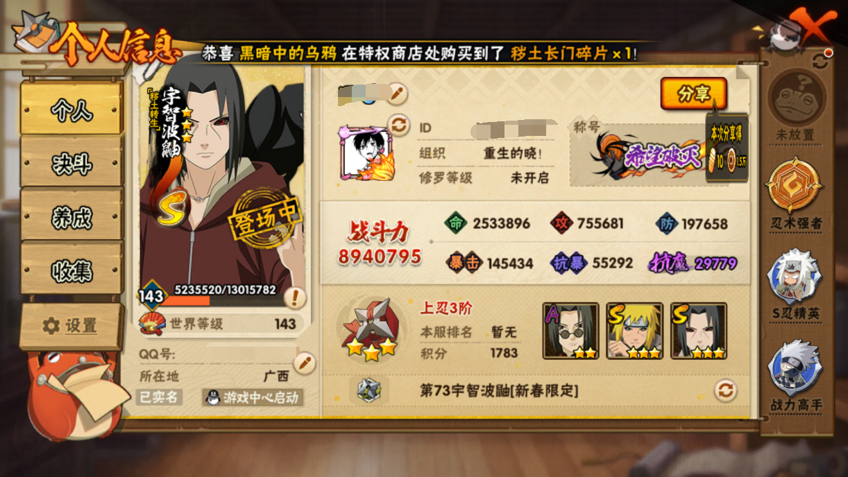 894w战力死水+白破16S+新春鼬2个198直购A+90五影斑碎片