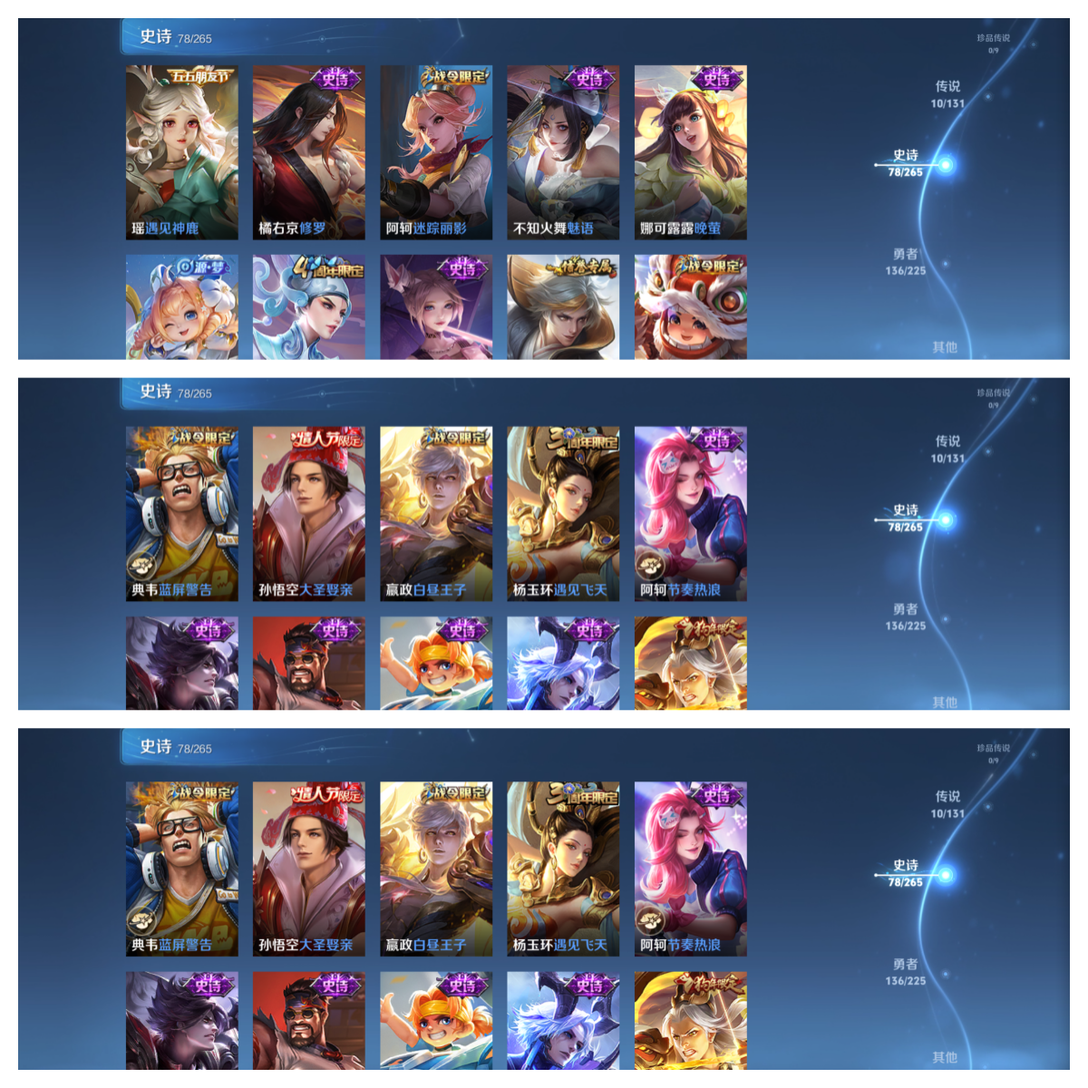 【史诗皮肤】 蔬乡物语 蔬乡物语 茶境仙 辉光之辰 器灵·浮梦炉 默契交锋 谧流熔炉 电玩小子 涂山容容 大圣娶亲 诗语江南 地狱燃心 遇见神鹿 星界特工 威尼斯狂欢 罗小黑战记 琥珀纪元 聚星闪耀 江河有灵 荣光圣徽 死神来了 绮世丹青 超时空战士 万灵启世 化蝶舞