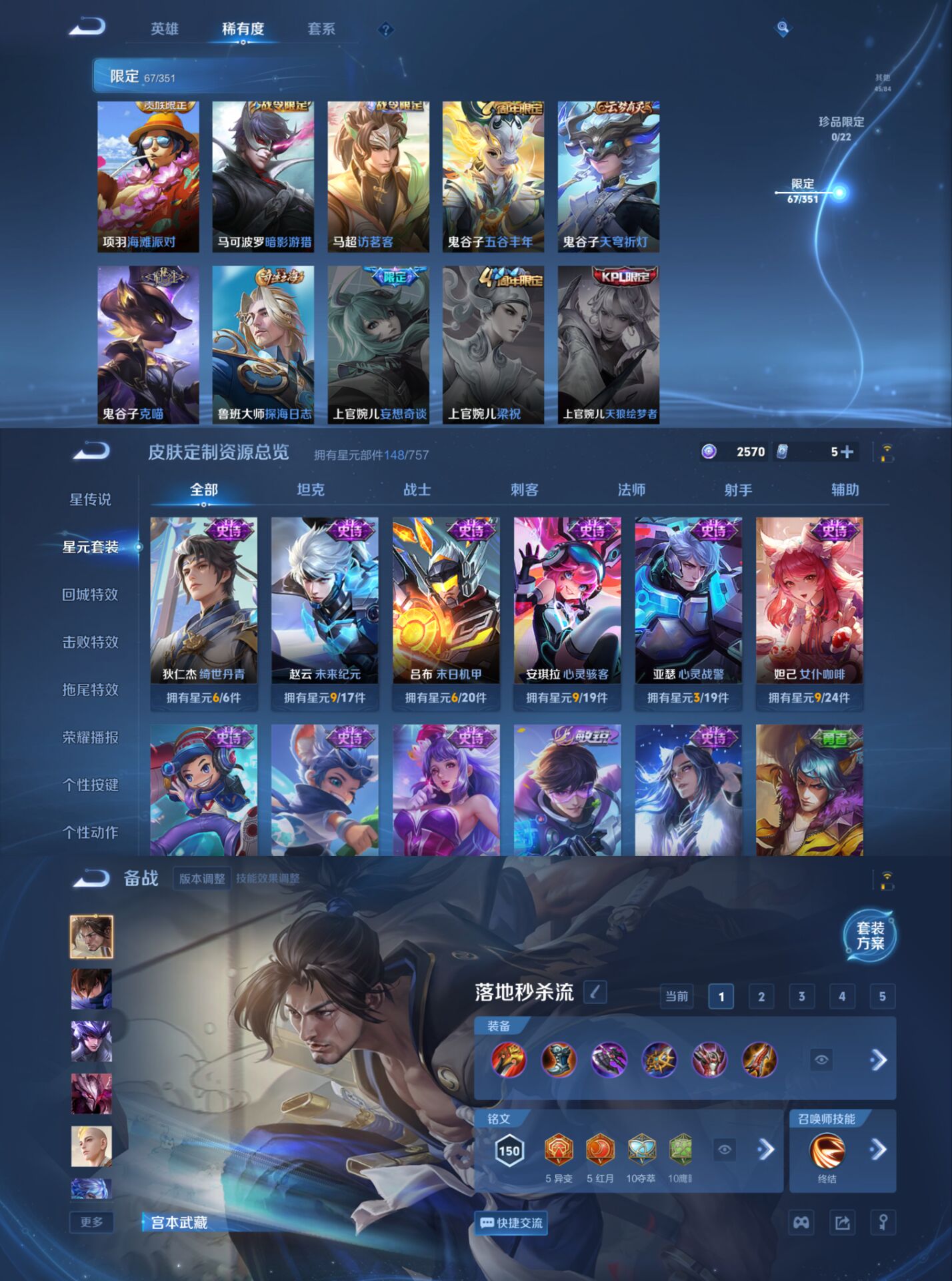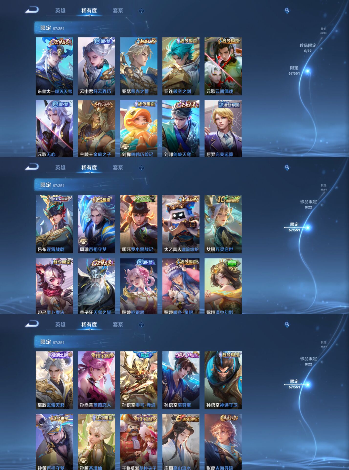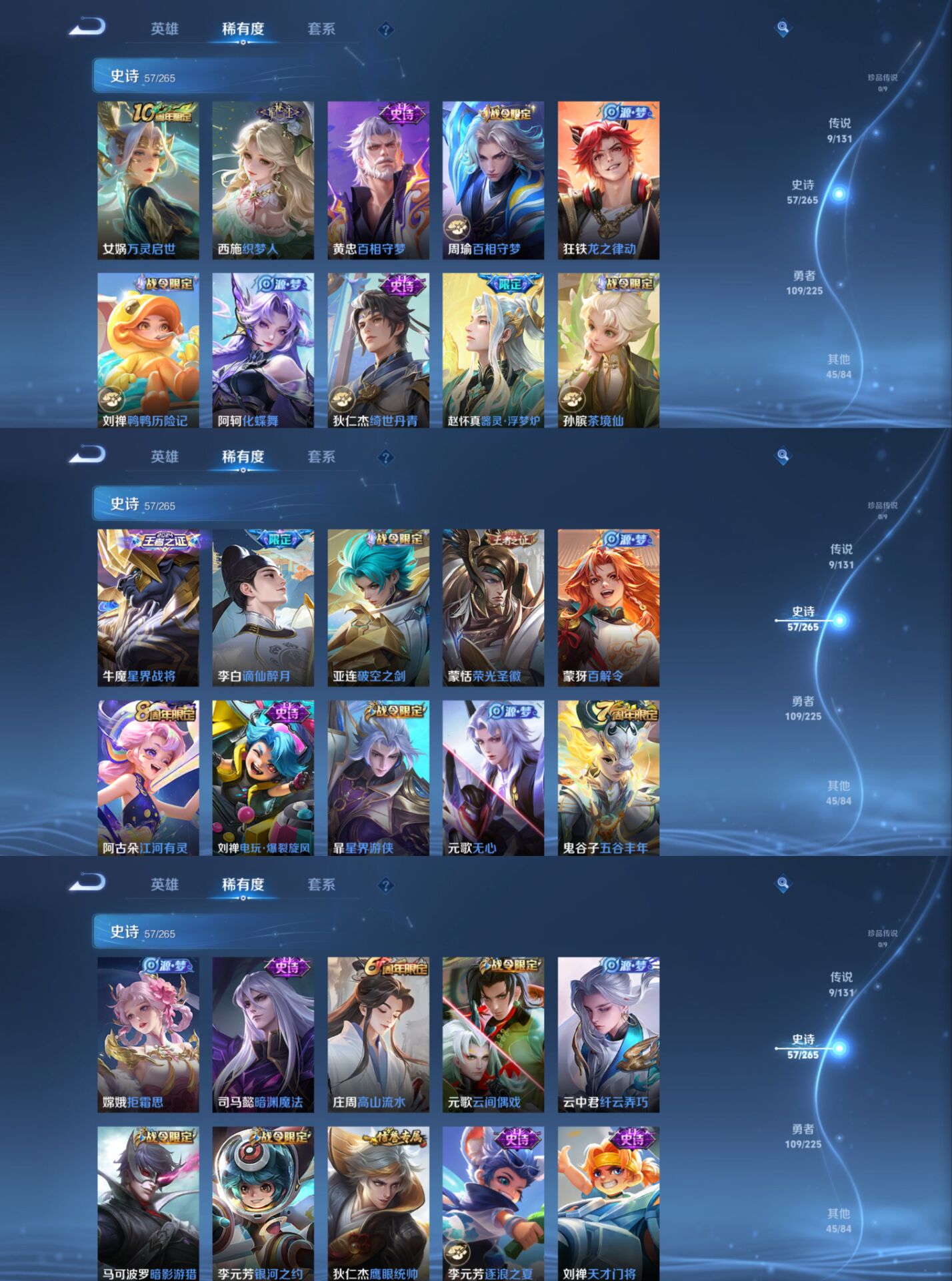 【史诗皮肤】 破空之剑 茶境仙 星界战将 器灵·浮梦炉 布丁狗之约 谧流熔炉 电玩小子 至尊宝 鸭鸭历险记 龙之律动 谪仙醉月 罗小黑战记 百相守梦 踏浪烽翎 王牌新星 聚星闪耀 江河有灵 百解令 荣光圣徽 百相守梦 漠中幻影 织梦人 绮世丹青 万灵启世 化蝶舞 星界游侠 舞动绿茵 拒霜思 女