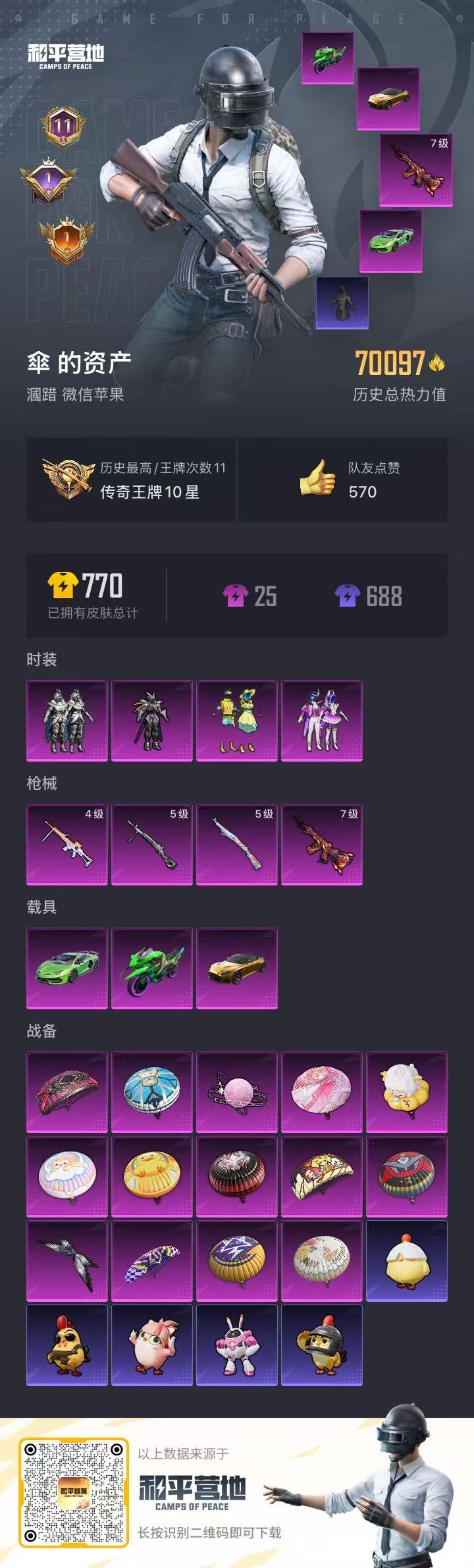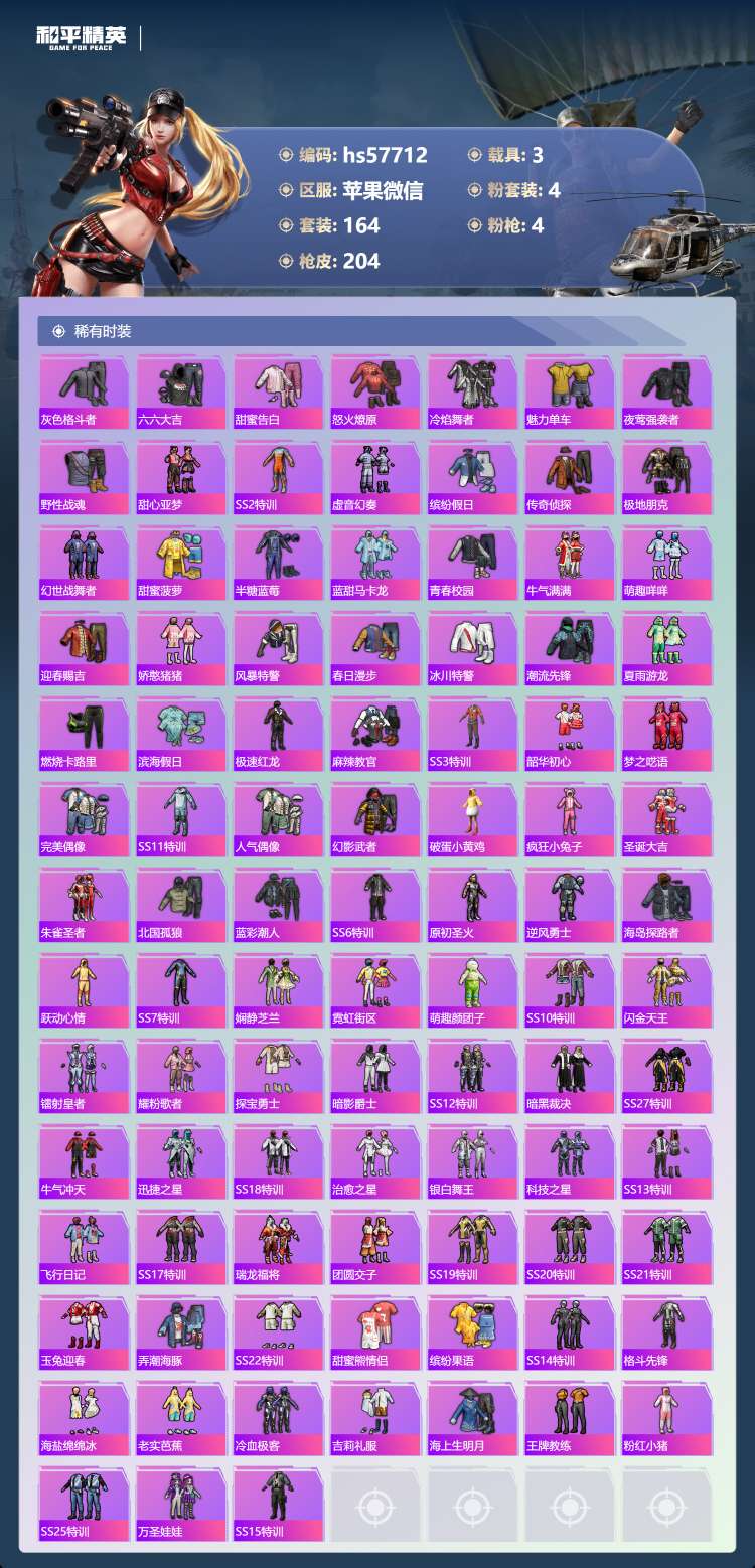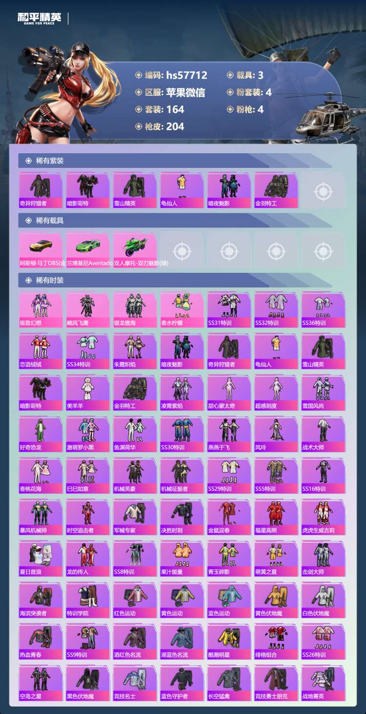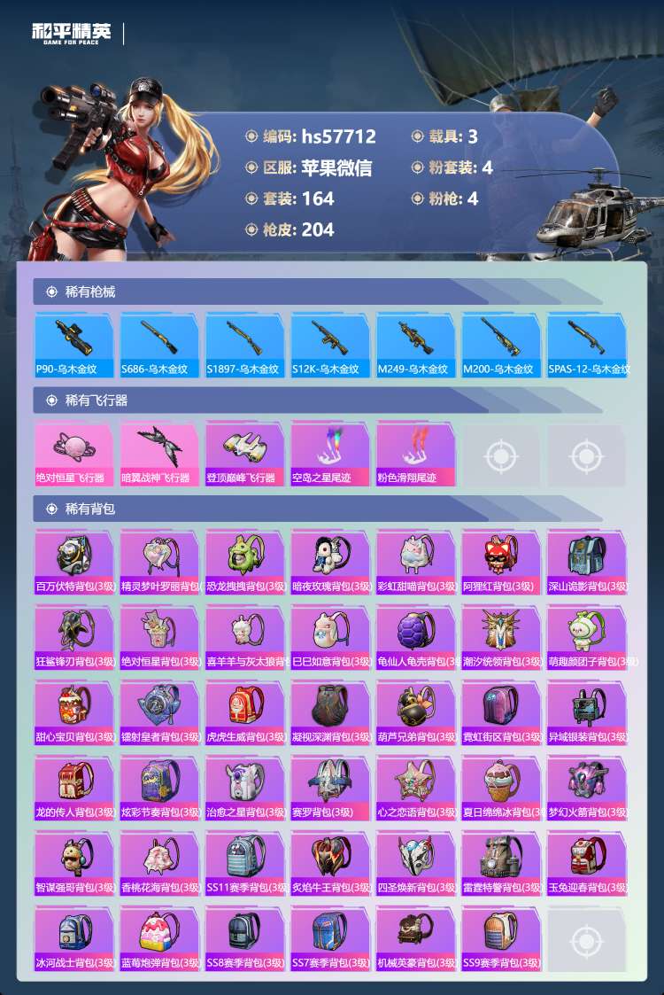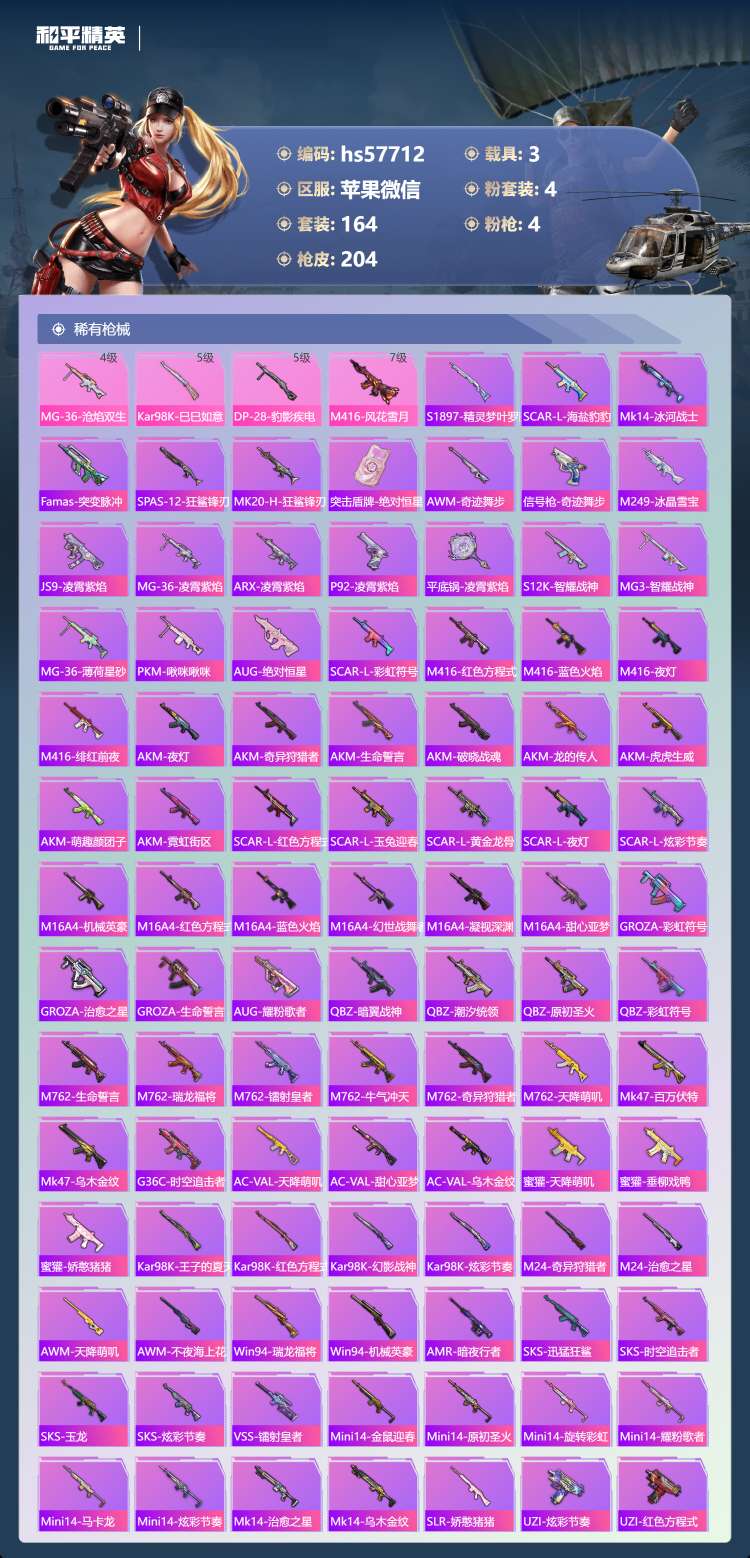 hs57712 苹果微-11王牌印记-4粉装-4特效枪-3载具-70285热力值-164套装-20