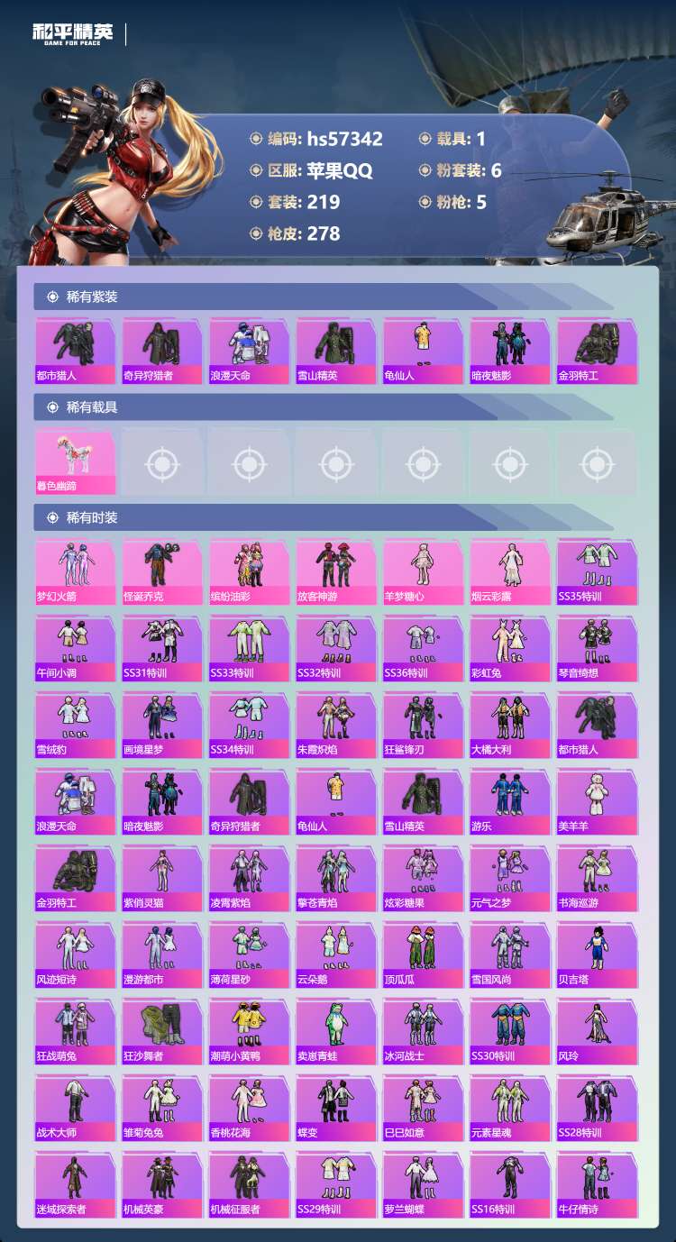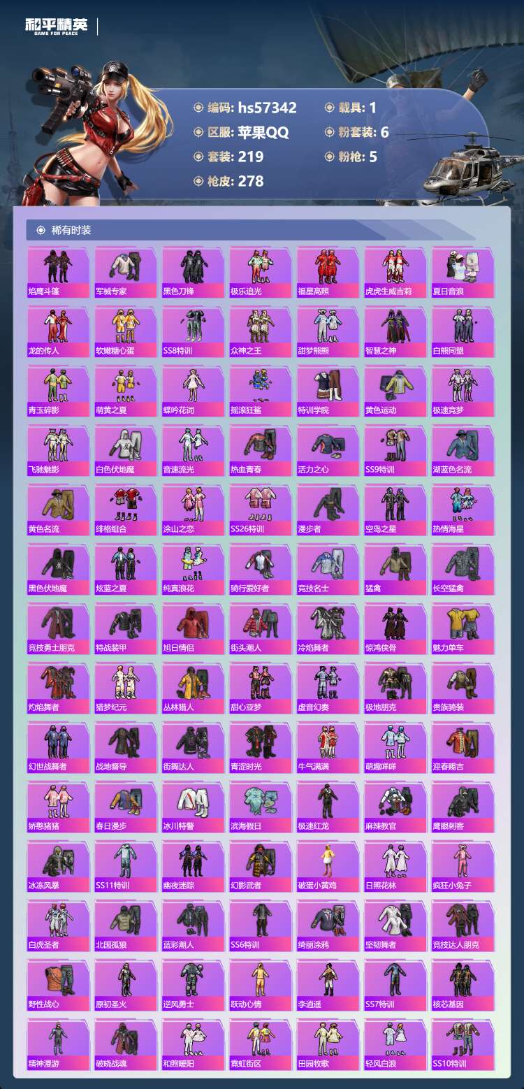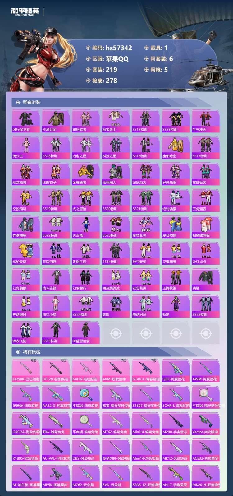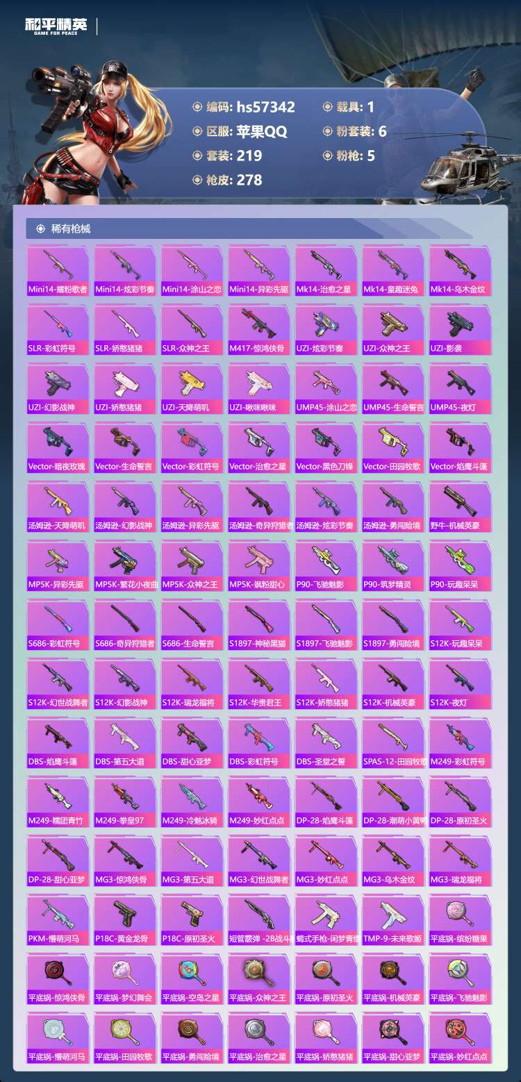 hs57342 苹果手Q-25王牌印记-6粉装-5特效枪-1载具-93585热力值-219套装-27