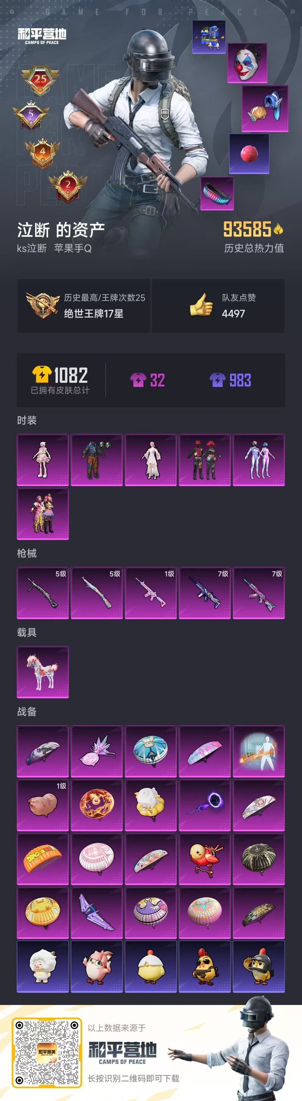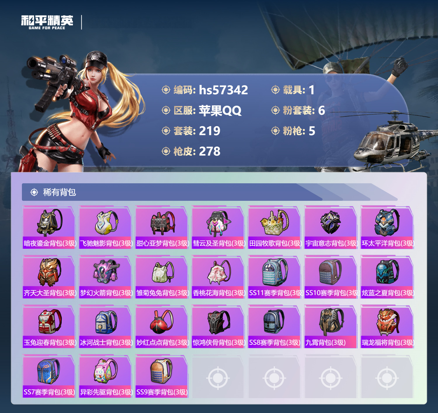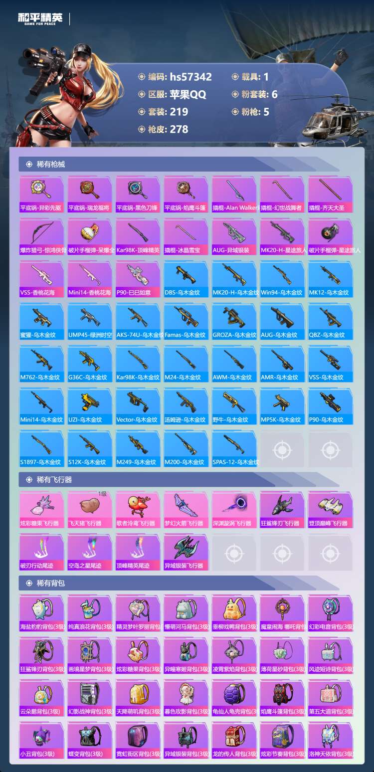 hs57342 苹果手Q-25王牌印记-6粉装-5特效枪-1载具-93585热力值-219套装-27