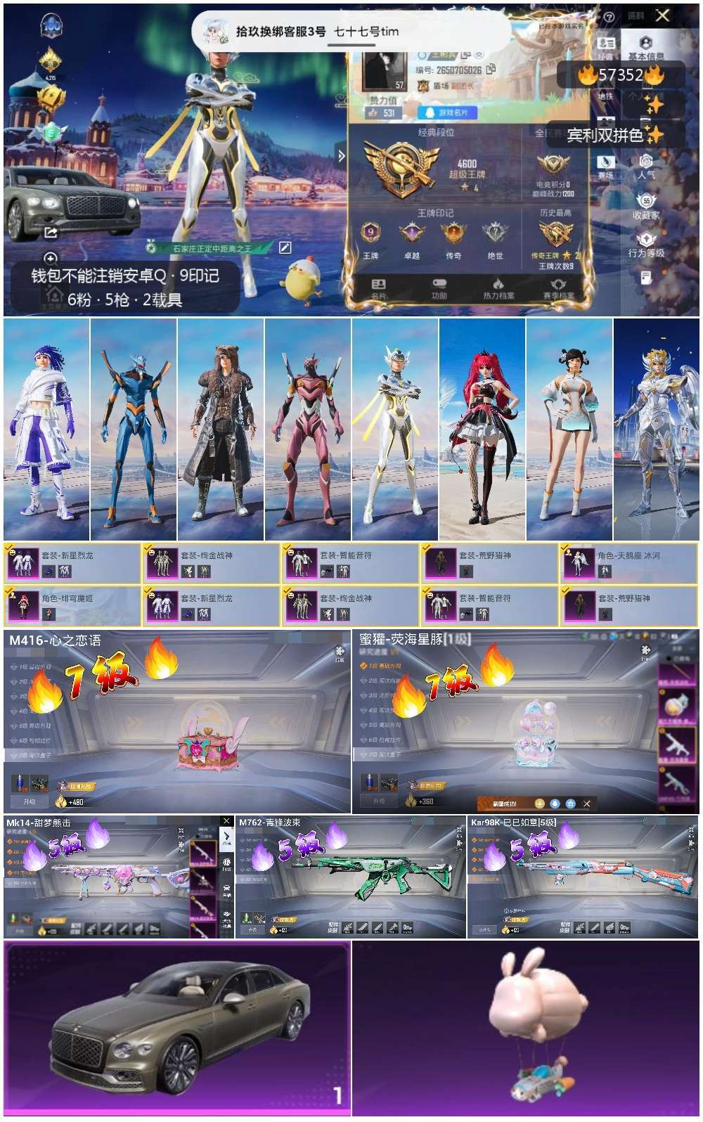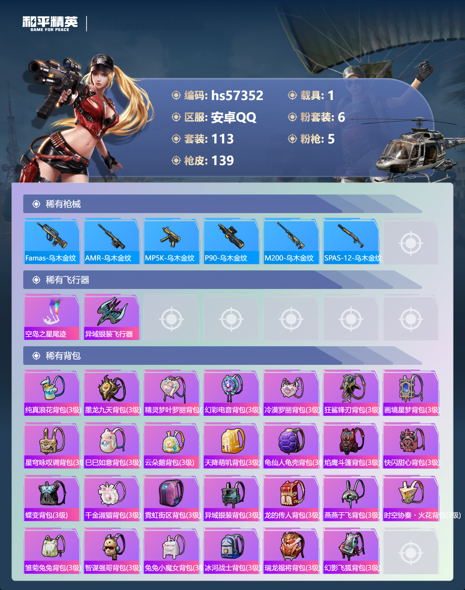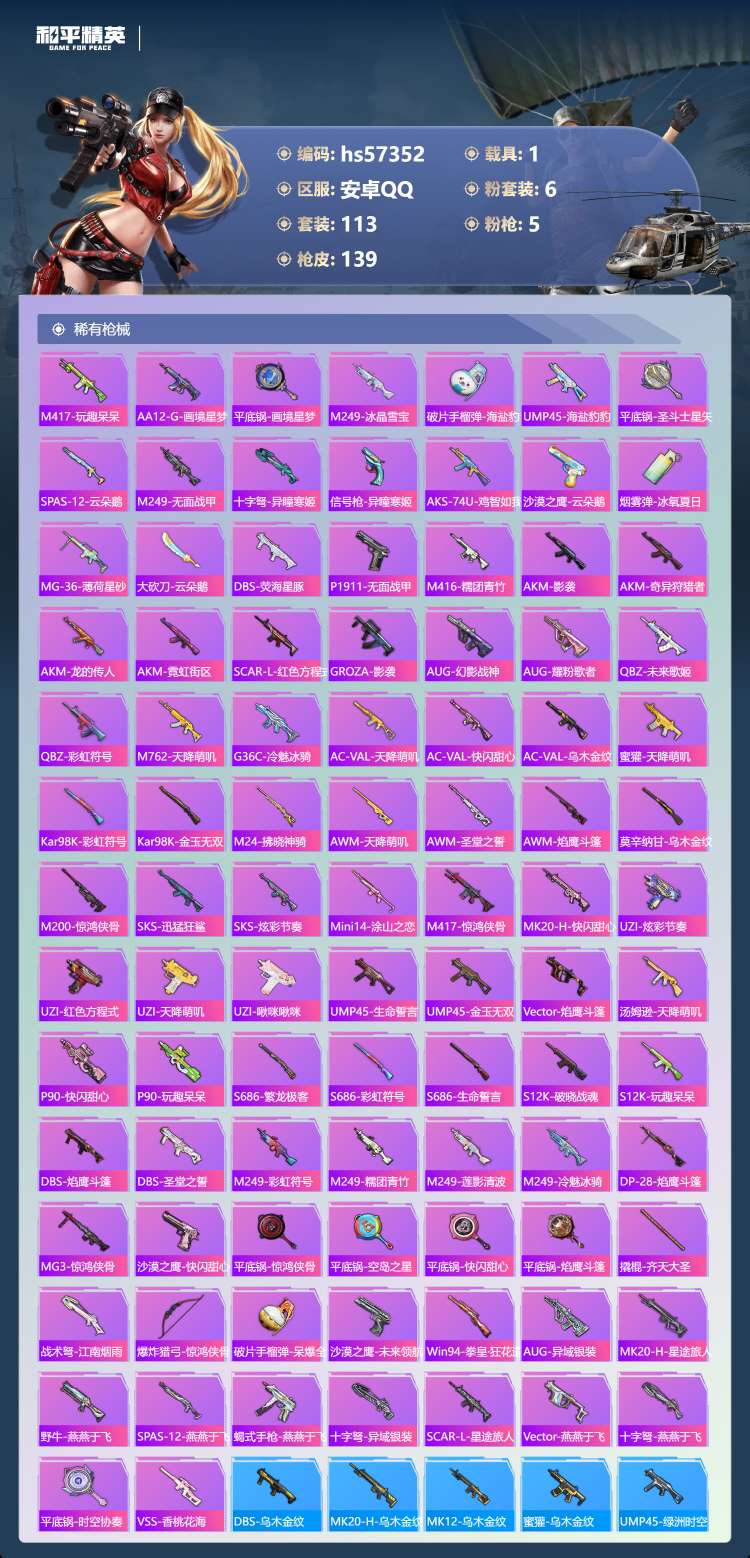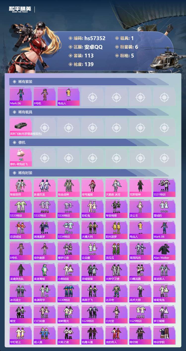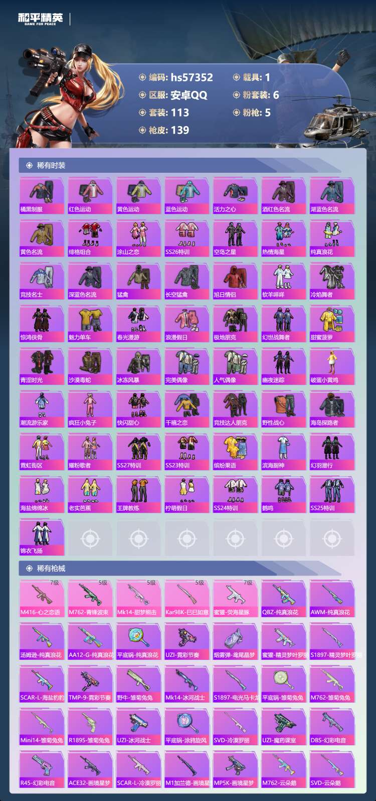 hs57352 安卓手Q-9王牌印记-6粉装-5特效枪-1载具-44268热力值-113套装-139